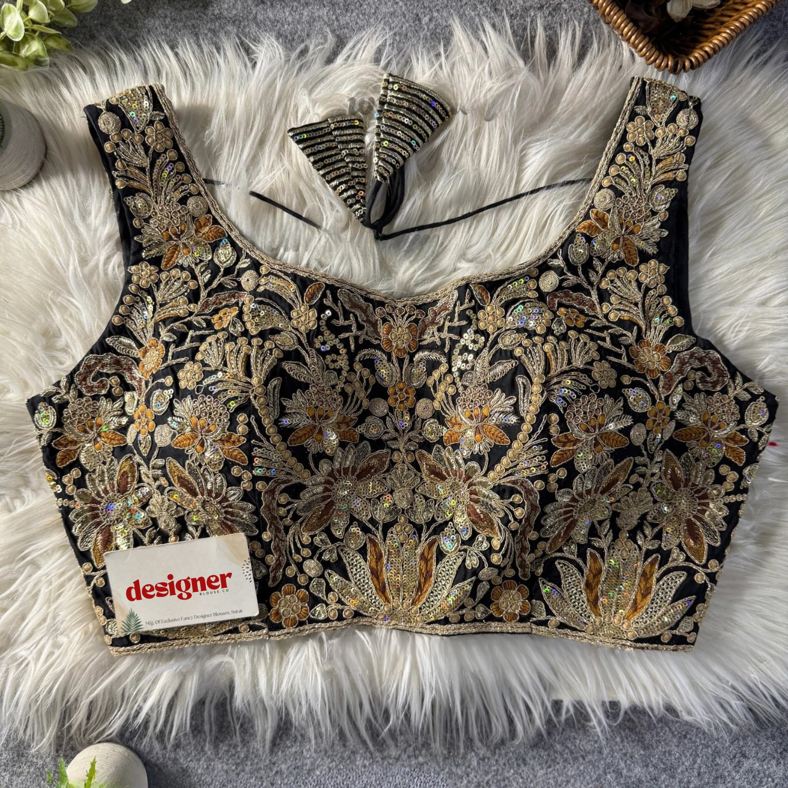 Shine in this premium Georgette readymade blouse featuring exquisite heavy coding and shimmering sequin handwork. Back-open with hooks, pure-cotton lining, and built-in pads ensure comfort and shape. Free size 38 with generous margins fits 34–42. A luxurious partywear essential perfect for weddings, receptions, and festive occasions.