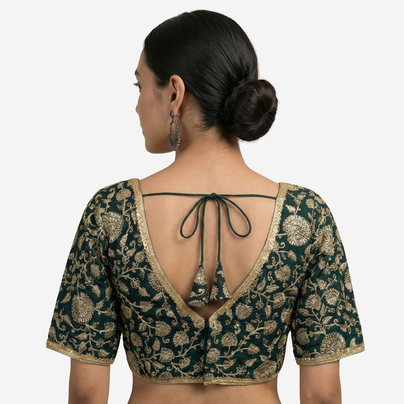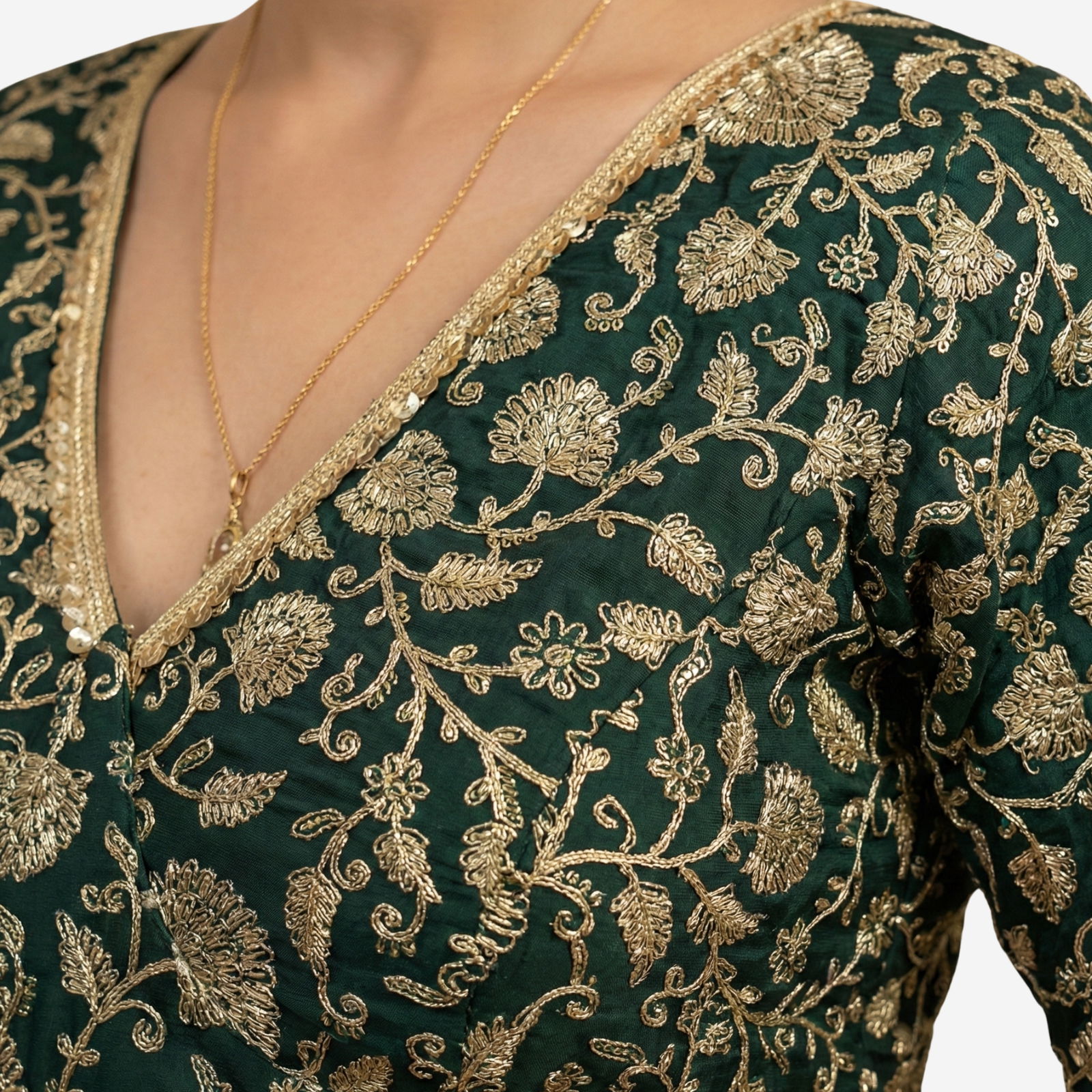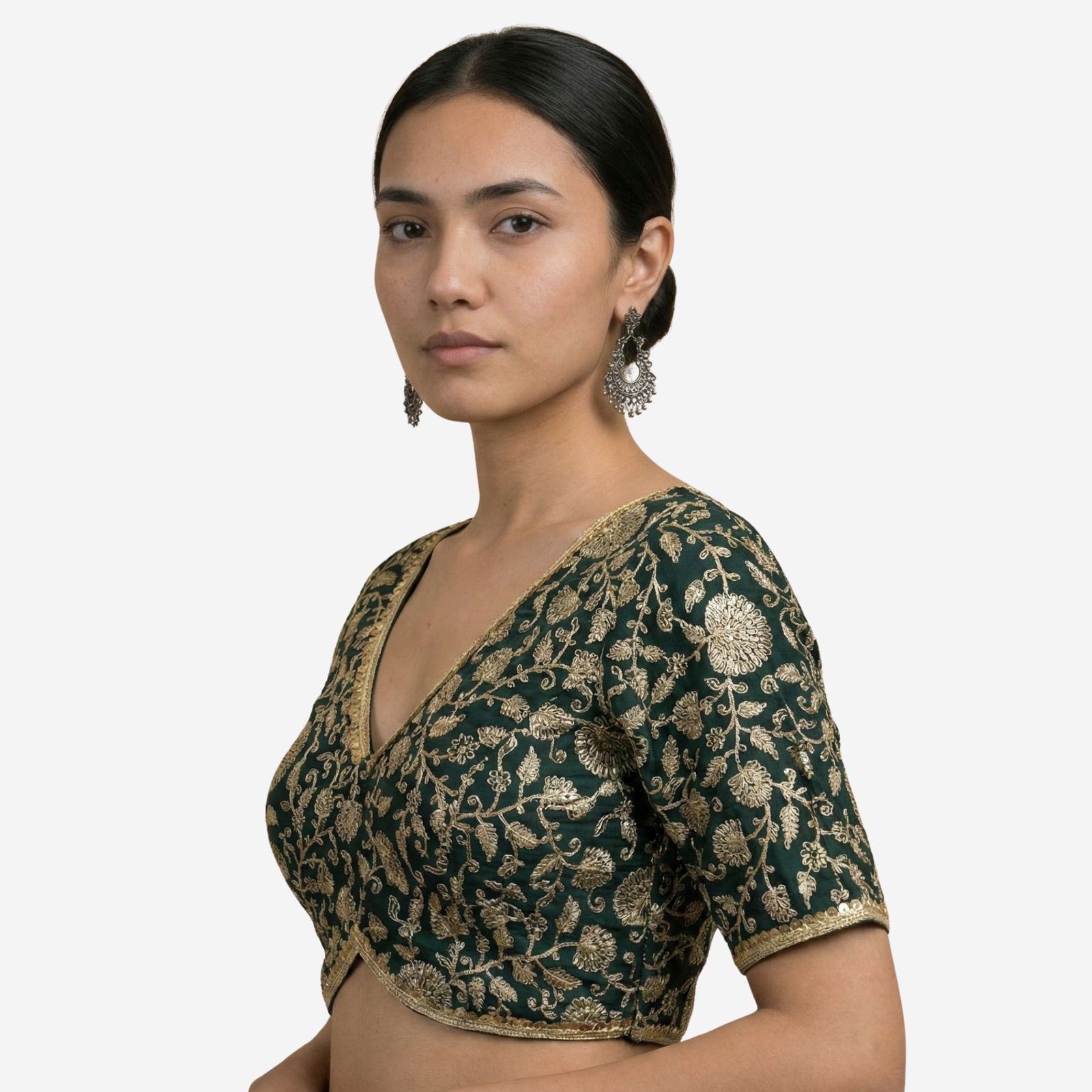 Make a bold statement with this stunning black deep neck blouse featuring intricate golden thread embroidery. Perfect for festive and party occasions, this readymade blouse blends tradition with a touch of glamour. Designed for confident women, our readymade blouse offers timeless elegance with unmatched comfort and graceful detailing in every stitch.