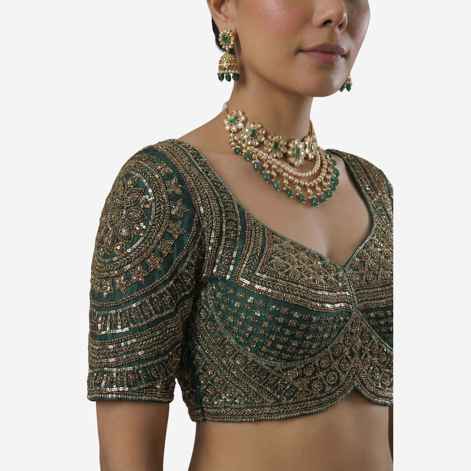 Glow in weddings and festive nights with this Rani Color Designer Partywear Blouse featuring a stunning Sabyasachi neck. Crafted in premium pure fox georgette, it’s richly finished with heavy hand embroidery and beadwork on front and sleeves. Soft cotton lining and built-in padding ensure comfort with a secure back-hook closure.