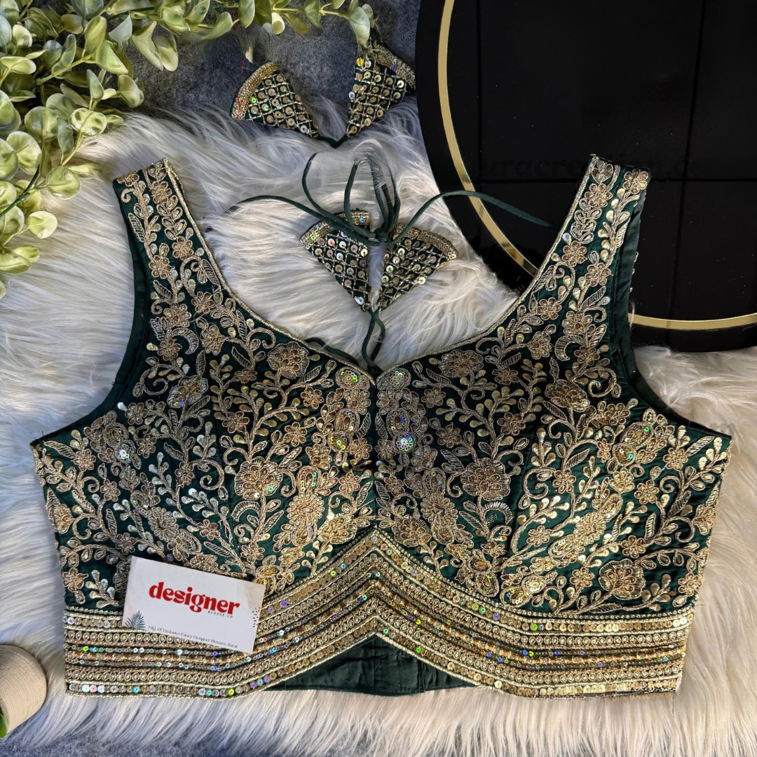 Elevate your saree look with this Italian silk designer blouse featuring heavy coding and shimmering sequin work. This readymade blouse comes padded with pure cotton lining, full sleeves and back-open hooks. it delivers a truly elegant premium finish for weddings, parties, and festive occasions.
