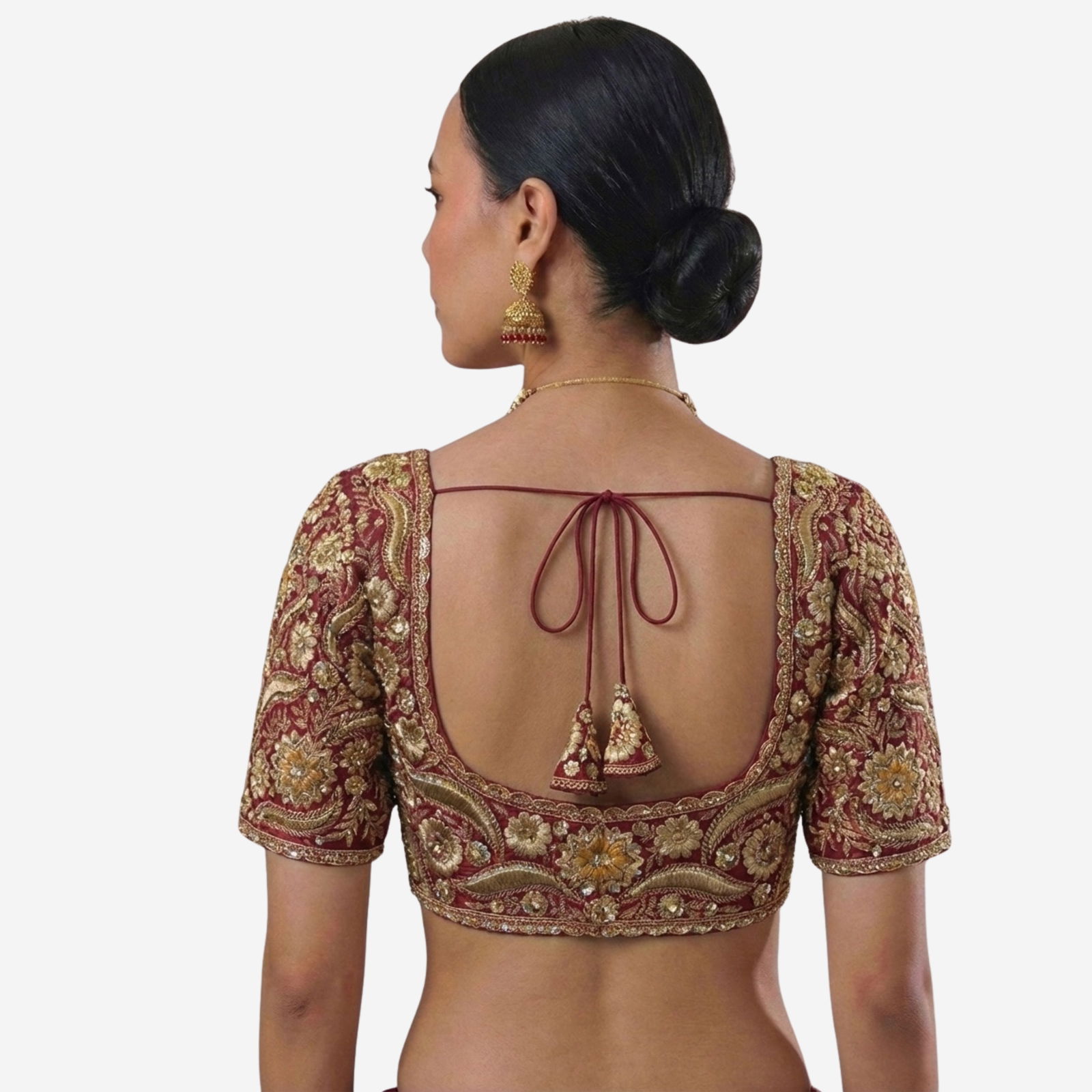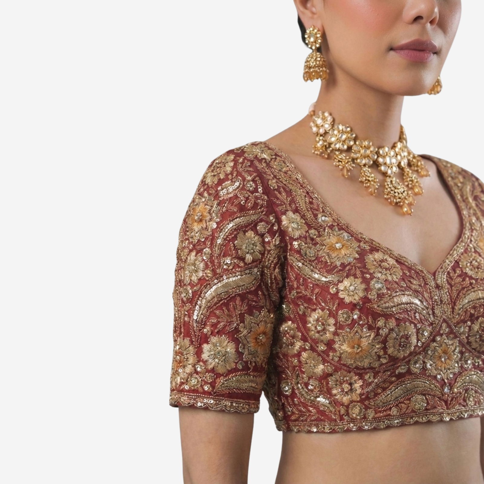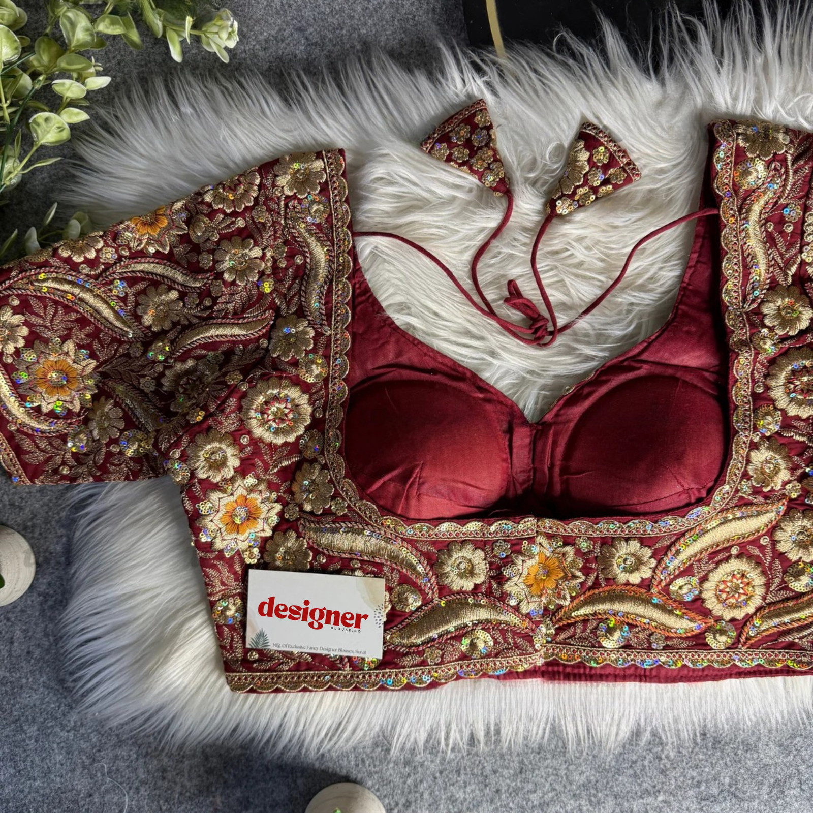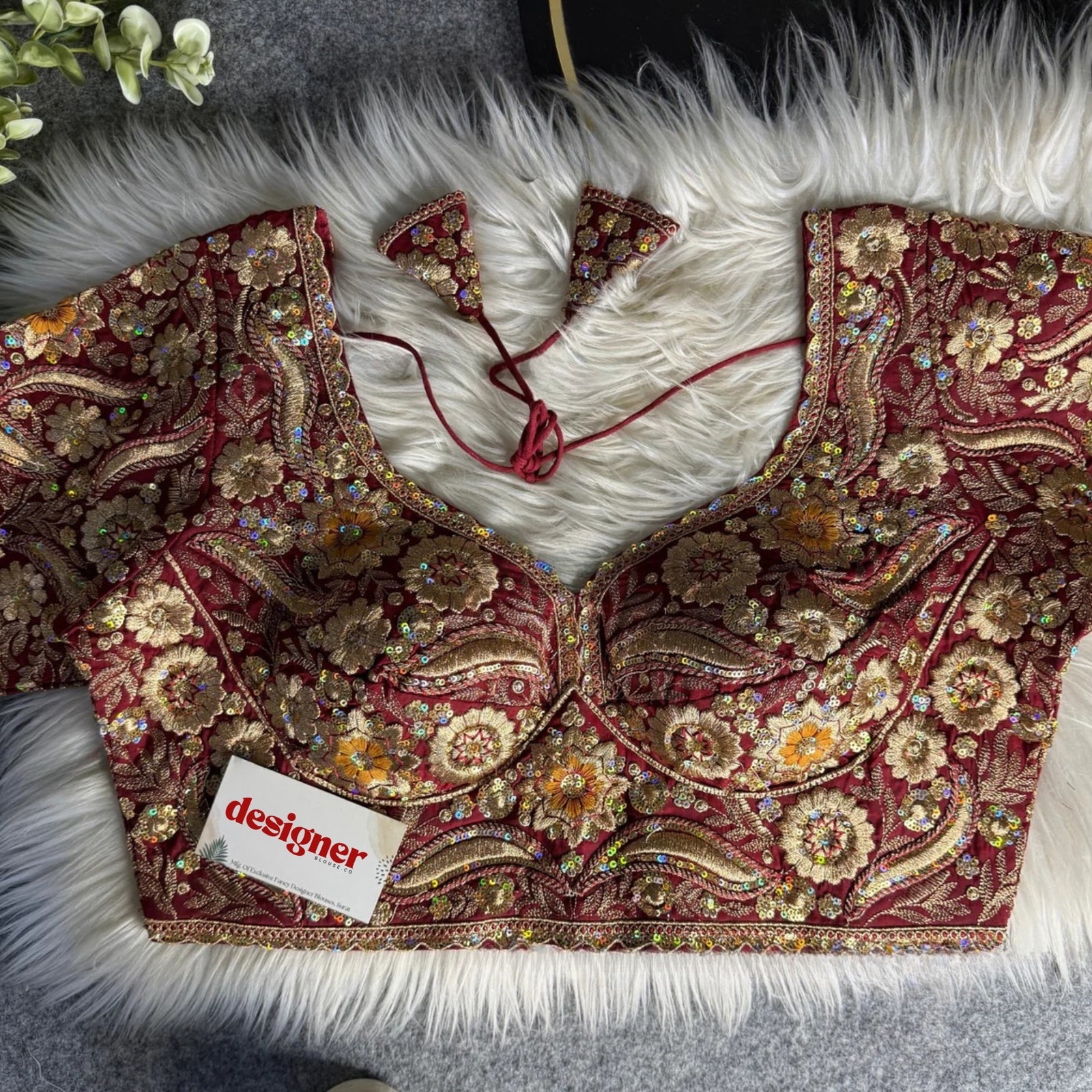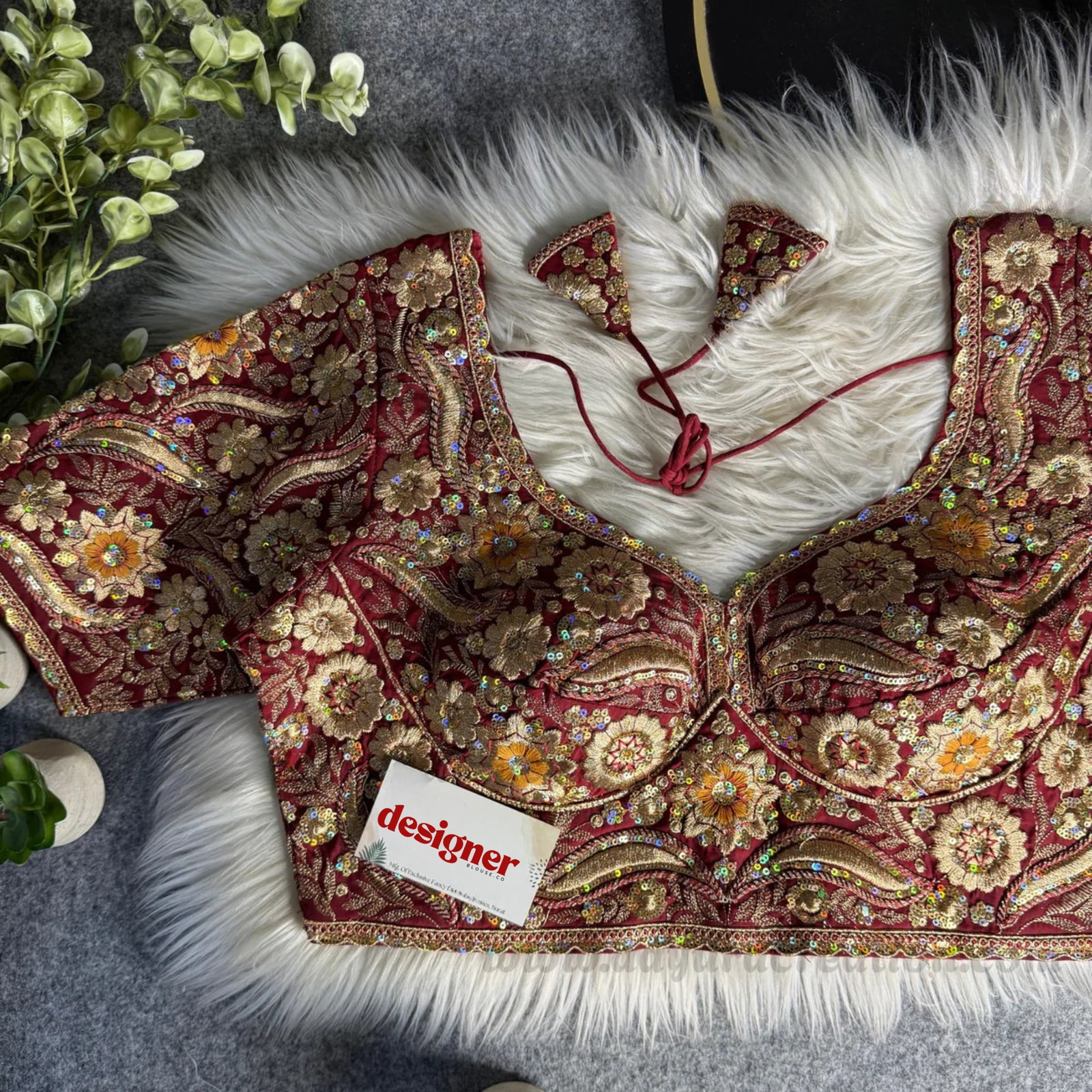 Elevate your bridal look with our Sabyasachi neck Italian Silk readymade blouse, richly embroidered with jari work. This designer bridal blouse offers a regal fit, cotton lining, and padding for comfort. Perfect for weddings, sangeet, and receptions, it pairs beautifully with sarees or lehengas for luxury and a radiant shine.