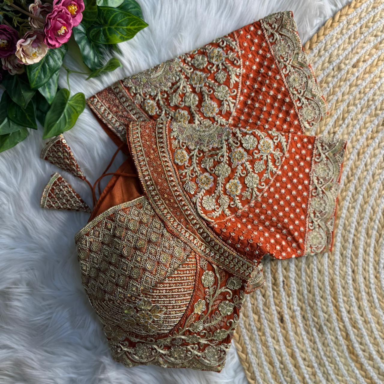 Make a grand bridal statement with this Madhubala style inspired heavy zari work bridal blouse in rich copper color, designed to reflect timeless royal elegance. Adorned with intricate floral zari embroidery, detailed borders, and elegant latkan tassels, it offers a luxurious textured finish that showcases refined craftsmanship and premium ethnic sophistication.