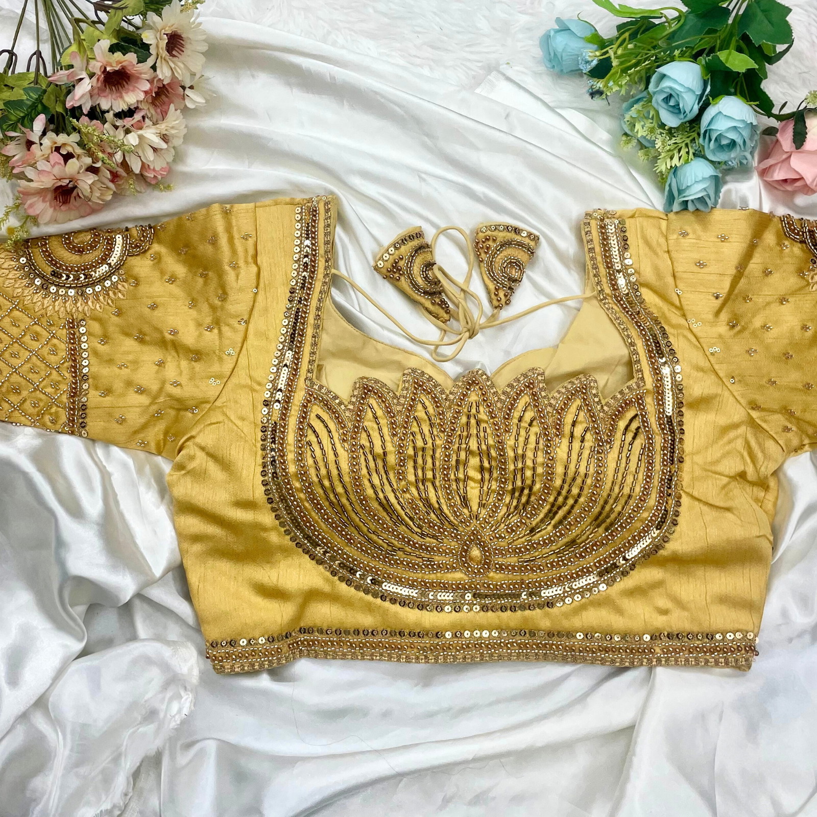This stunning designer blouse features rich sequin work in lotus-inspired motifs, perfect for festive and wedding looks. Crafted in premium silk fabric, it radiates elegance and tradition. The readymade blouse offers impeccable embroidery on sleeves and neckline, making it a must-have festive wear blouse. A perfect pick for bridal and ethnic looks.