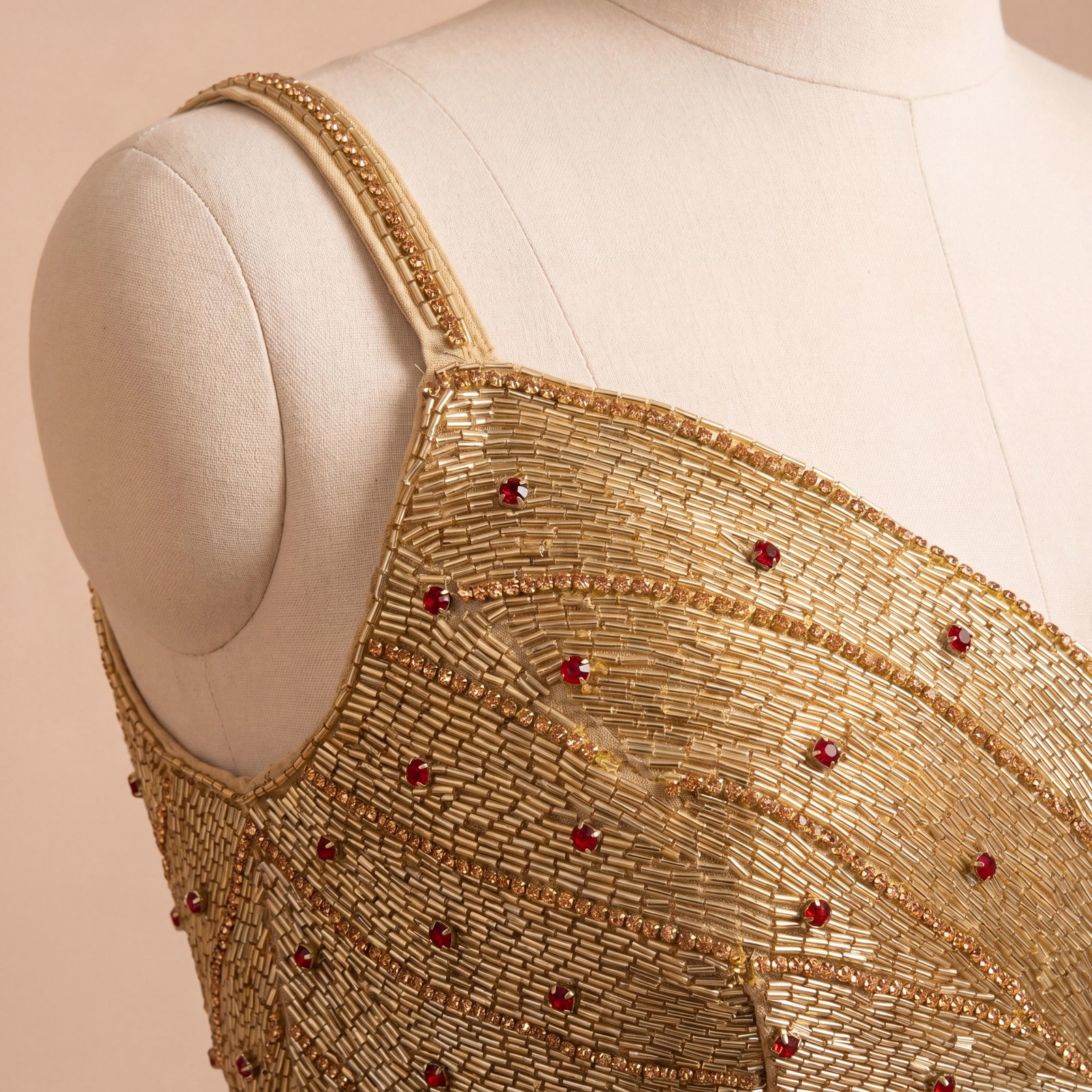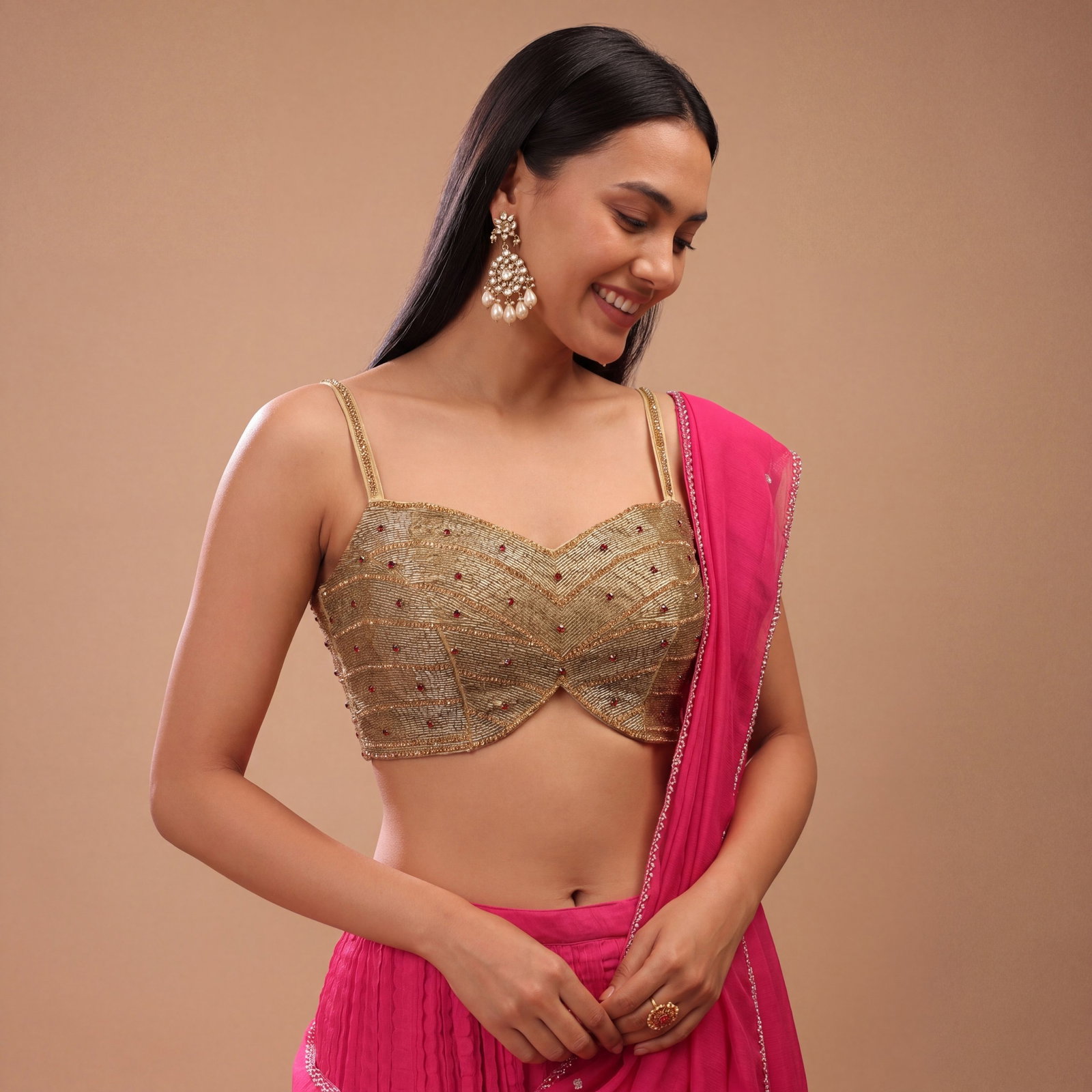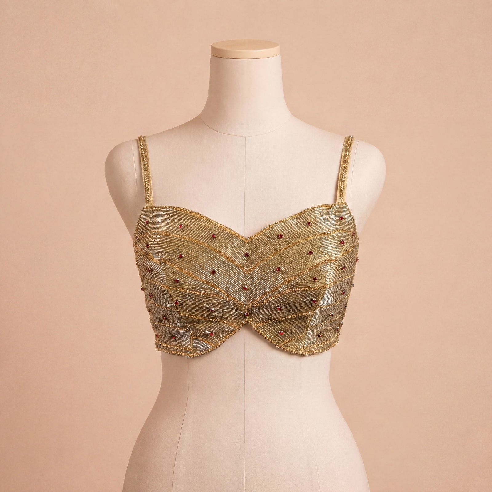 This stunning golden blouse is crafted with fine embroidery and subtle embellishments, offering a rich and elegant look. Featuring a stylish sweetheart neckline and delicate spaghetti straps, it enhances your silhouette beautifully. Perfect for pairing with sarees or lehengas, this blouse is ideal for weddings, parties, and festive occasions. Designed for comfort with a premium finish, it adds a glamorous touch to any ethnic outfit.