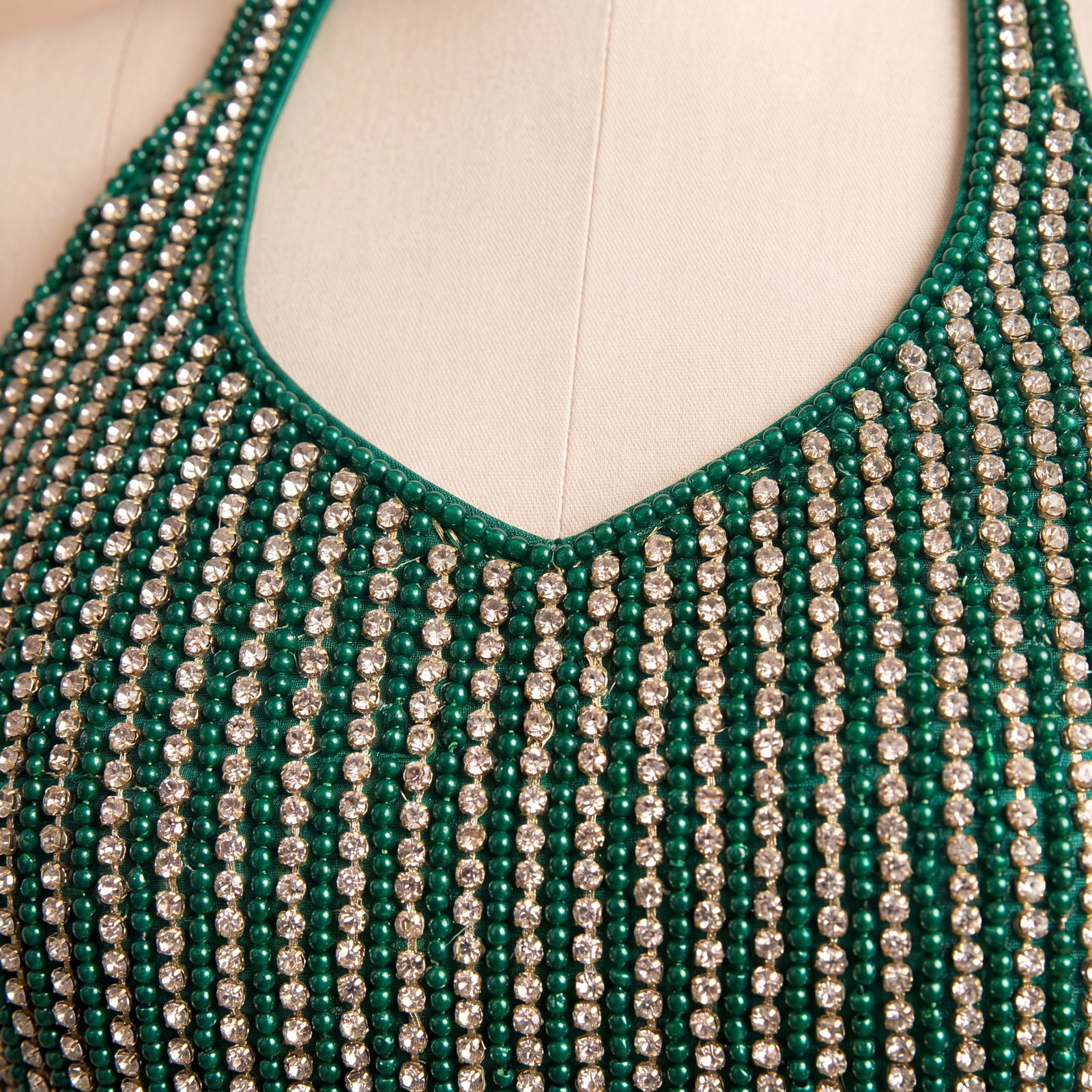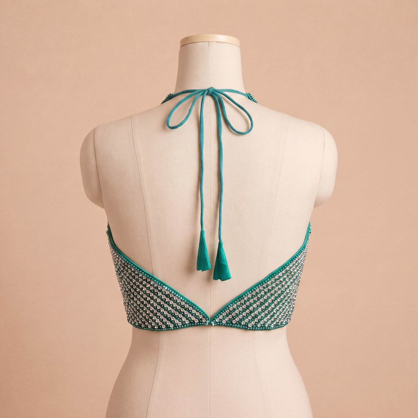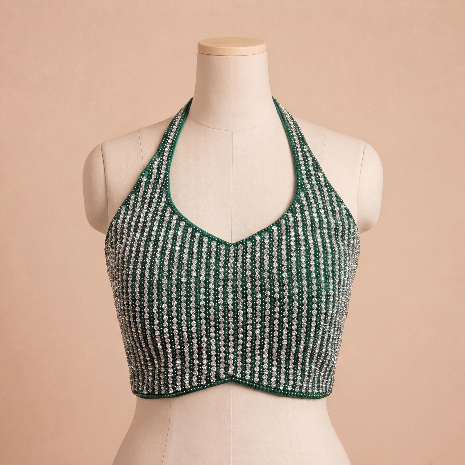 Add a touch of glamour to your ethnic wardrobe with this stunning black halter neck blouse, adorned with intricate bead and sequin embroidery. Designed with a flattering sweetheart neckline and elegant draped pattern, it enhances your silhouette beautifully. Perfect for cocktail parties, weddings, and festive occasions, this blouse offers a premium finish with a bold and sophisticated appeal.