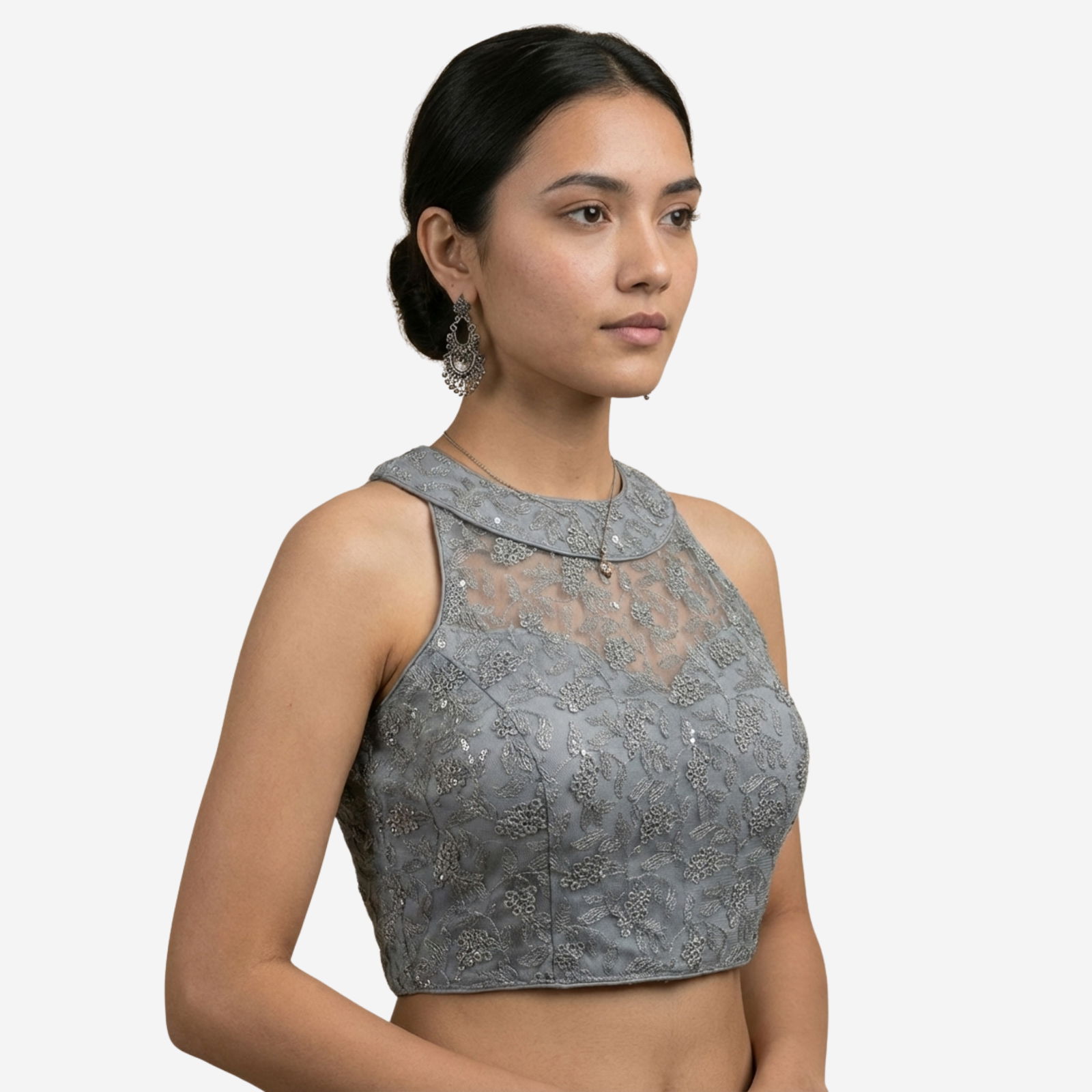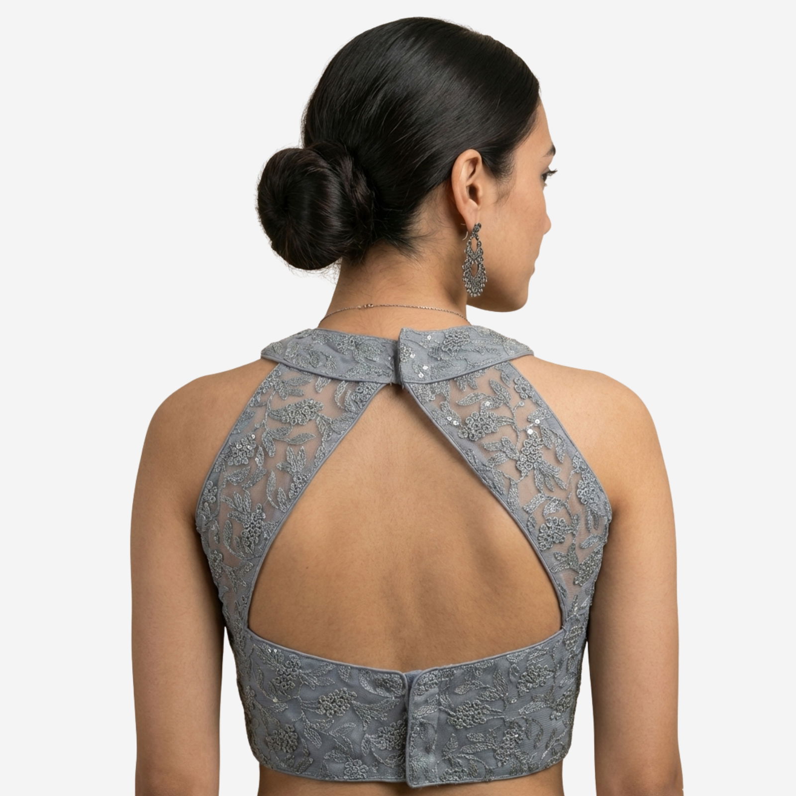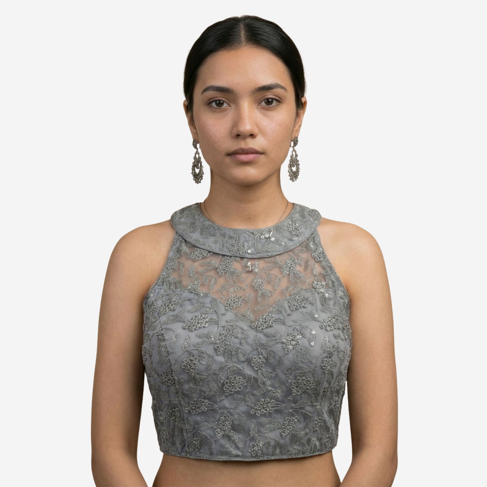 This designer partywear blouse is crafted from premium imported net, featuring heavy stitching, padding, and intricate work that adds charm to any festive or wedding look. Designed in a stylish back open pattern with detailed craftsmanship, it's a versatile piece that fits beautifully and offers alterable sizing from 36 to 40.