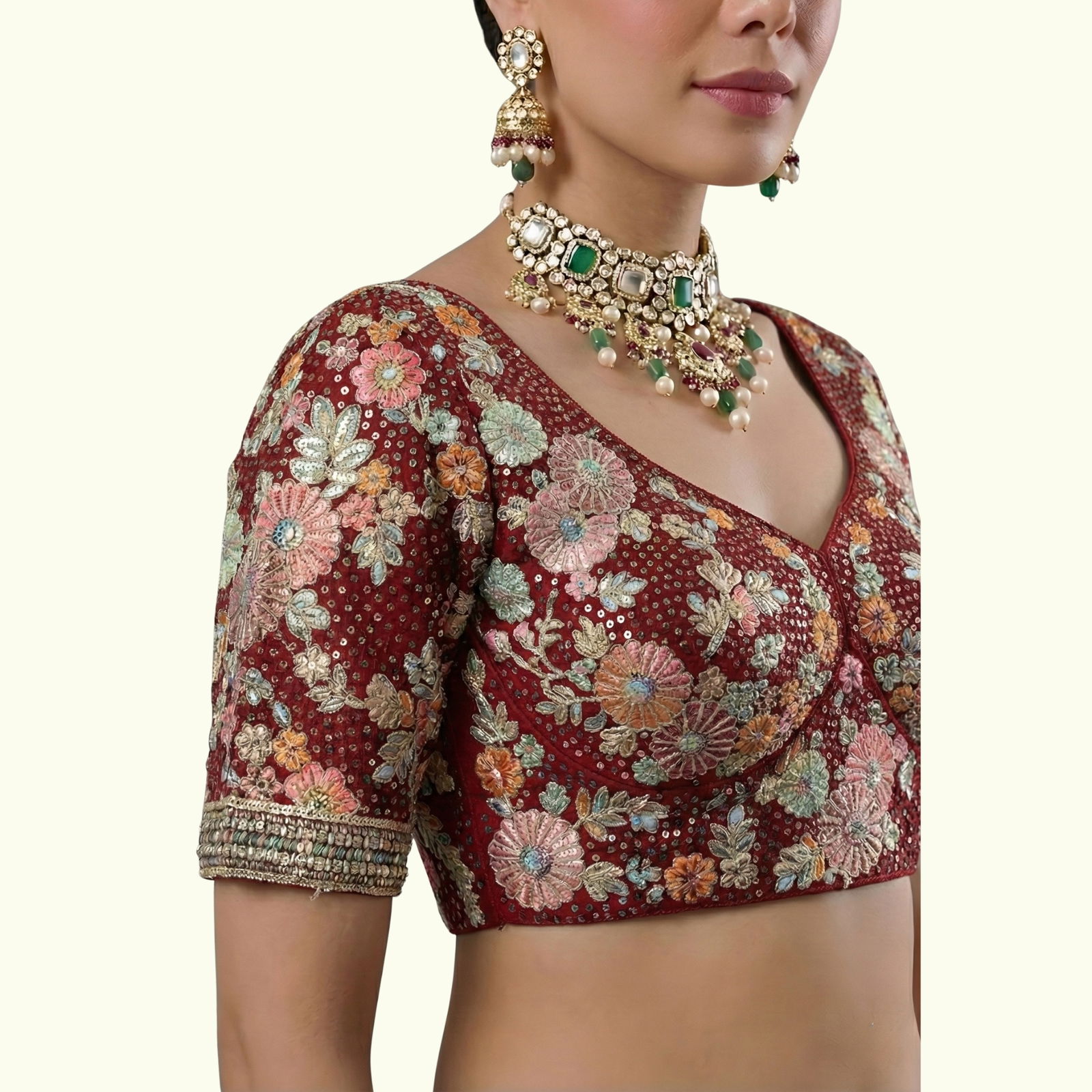 Step into elegance with this stunning wedding and partywear blouse made from heavy Fox Georgette. Featuring rich sequence and embroidery work, it comes with 9-inch long sleeves, heavy padding, and designer back-open styling. A perfect choice for festive and bridal occasions, offering comfort and flair in size 40, alterable up to 42.