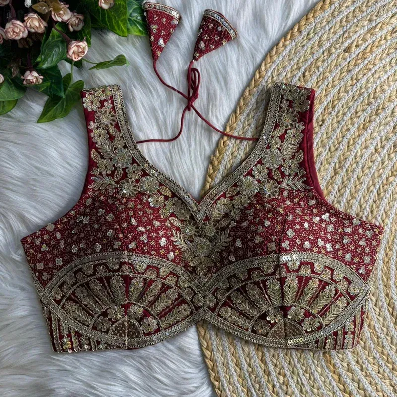 Turn heads at every function in this Heavy Jari + Sequence Thread Work partywear blouse, crafted in premium Heavy Soft Roman Silk for a rich, smooth feel and a festive shine. The blouse features beautiful handmade detailing with heavy stitching for a perfect structured look, along with heavy padding that gives an elegant shape and confident fit.