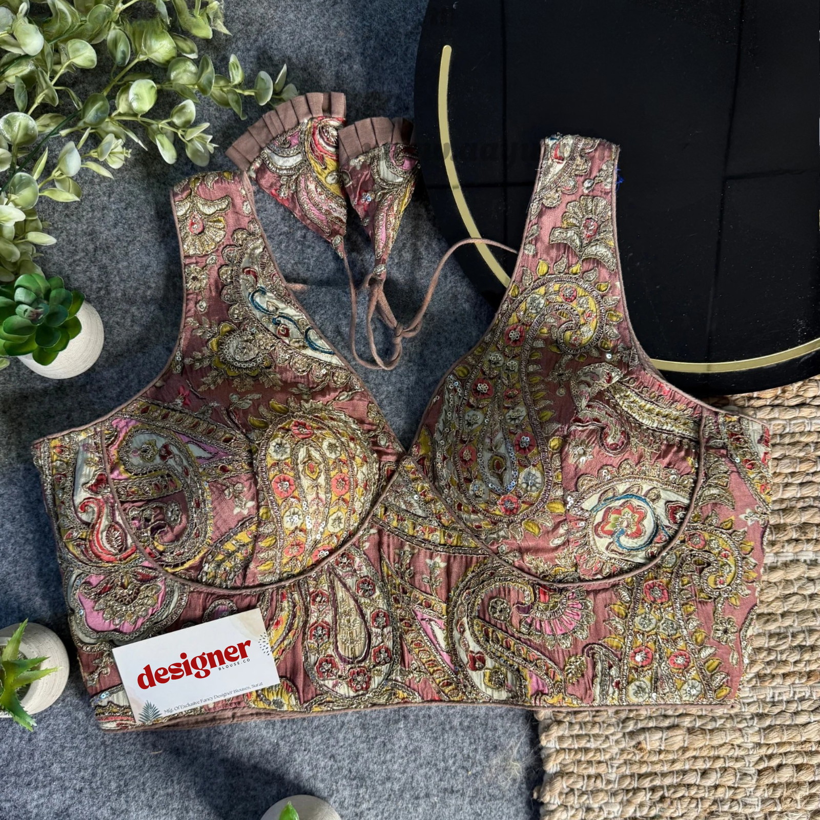 Embroidery Work V Neck Designer Blouse in premium heavy Chinnon fabric with exquisite position embroidery and stylish halter neckline. Comfortably padded with pure cotton lining, back open with hooks and attached inner sleeves. Free size, alterable up 34 to 42, perfect for all grand festive saree and lehenga looks