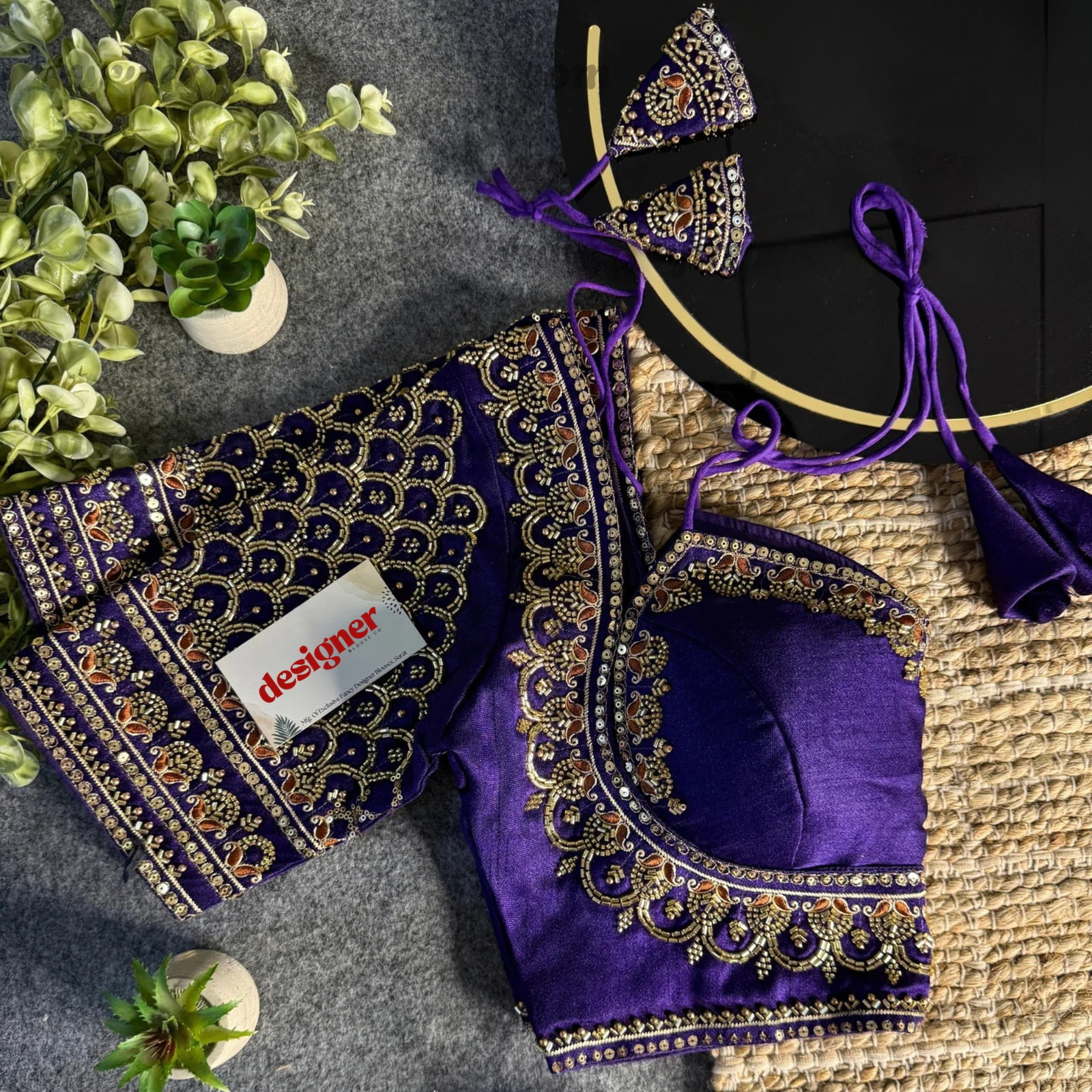Elegant Italian Silk halter neck blouse with beautiful beads and rich embroidery work. Padded and back-open with hooks, this free-size designer blouse fits 34–42 bust and pairs perfectly with any saree or lehenga for weddings, receptions, and festive occasions.