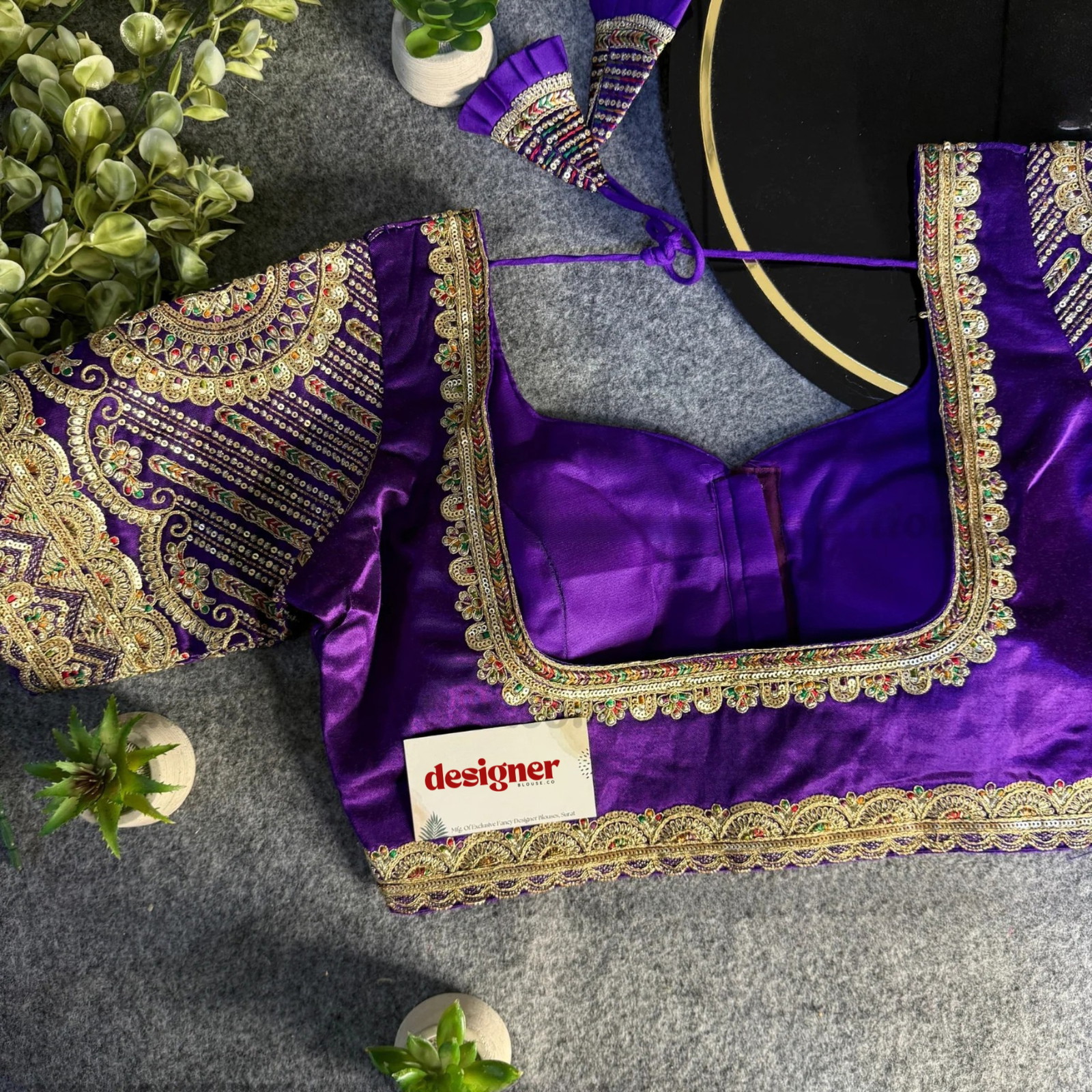 Beautiful Embroidery Work Designer Blouse in rich Gajji Silk, styled for a premium festive and traditional look. This padded front-open blouse with hooks, 15-inch length and 10+ inch sleeves fits 34–42 bust comfortably, adding timeless elegance and sophistication to any saree or lehenga for weddings and special occasions.