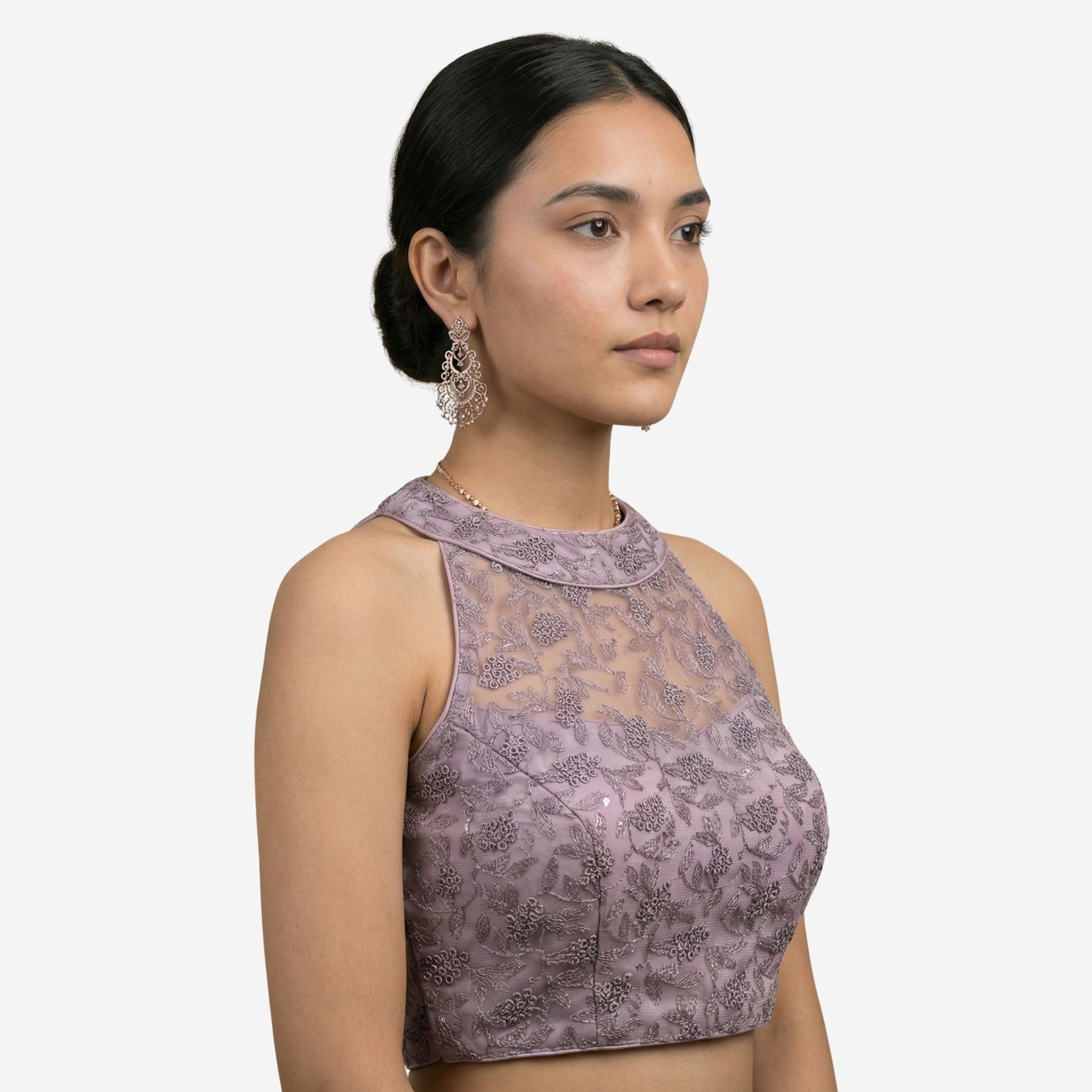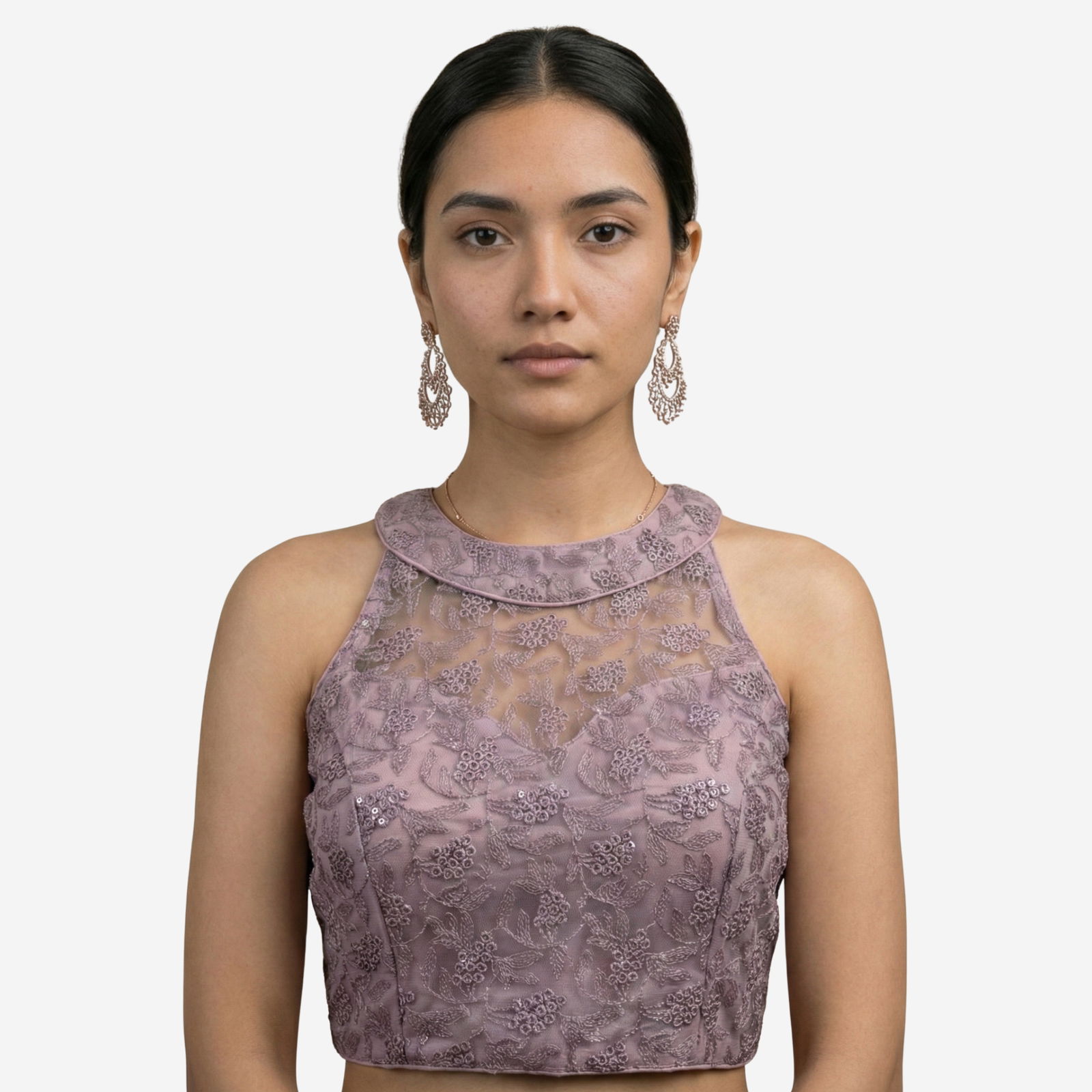 This designer partywear blouse is crafted from premium imported net, featuring heavy stitching, padding, and intricate work that adds charm to any festive or wedding look. Designed in a stylish back open pattern with detailed craftsmanship, it's a versatile piece that fits beautifully and offers alterable sizing from 36 to 40.