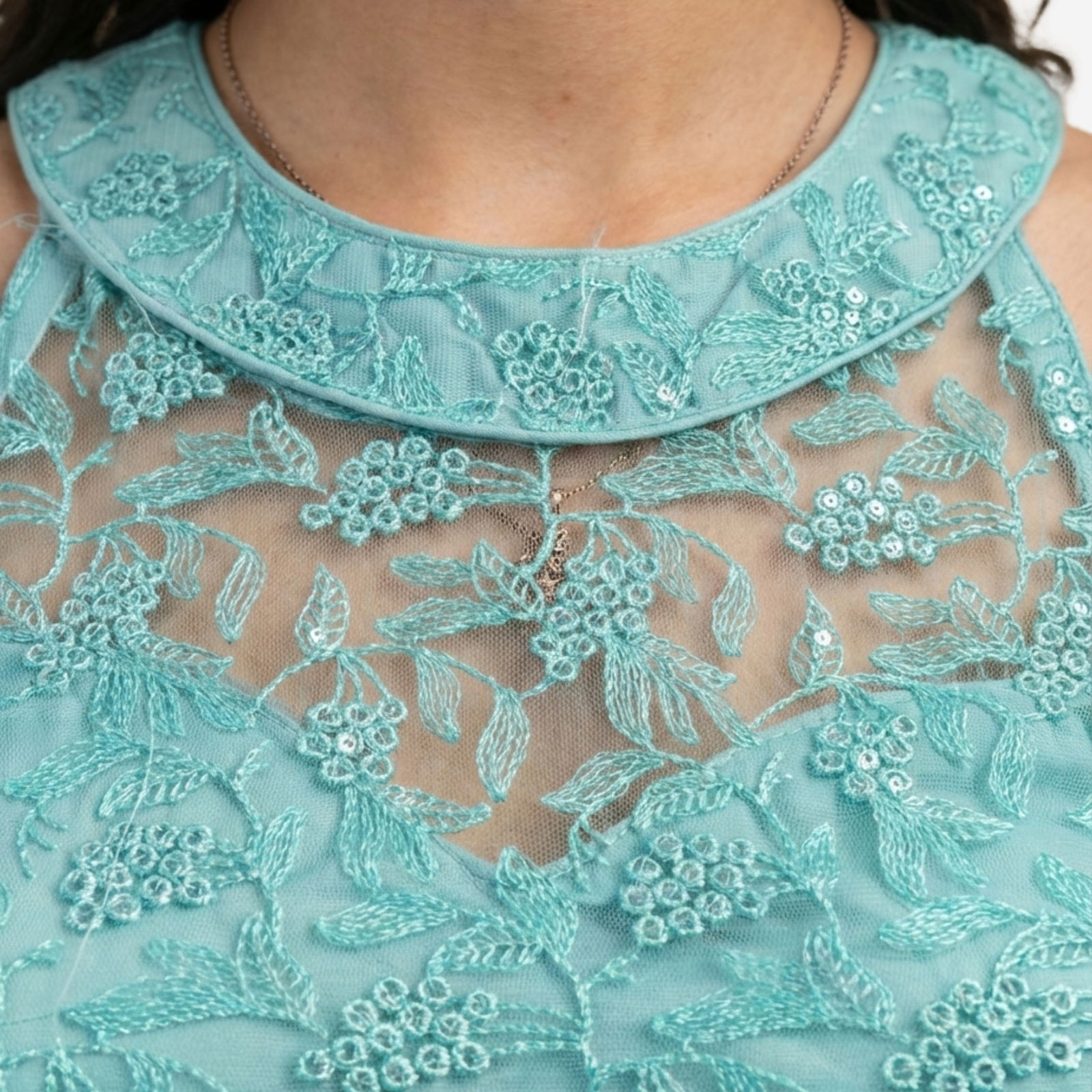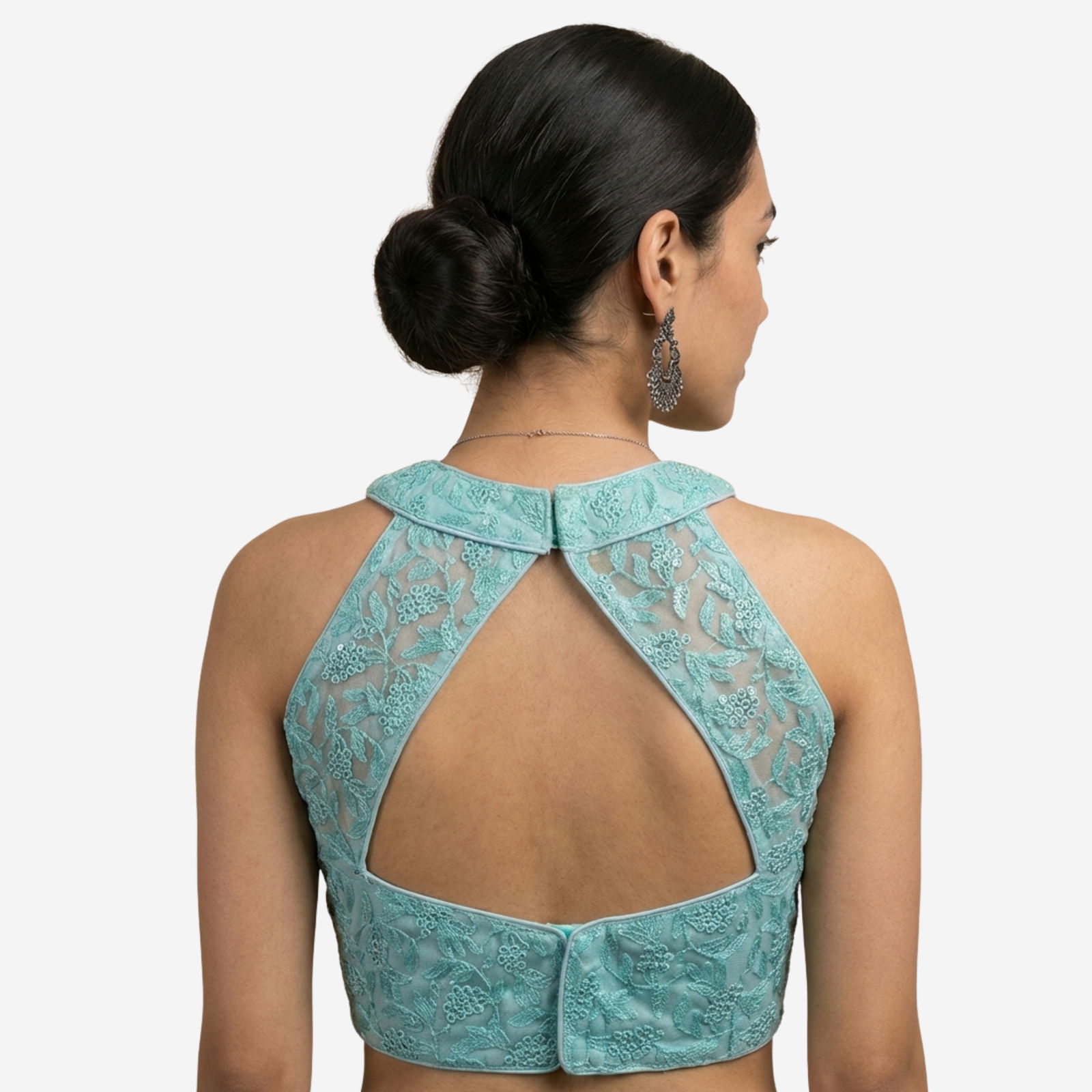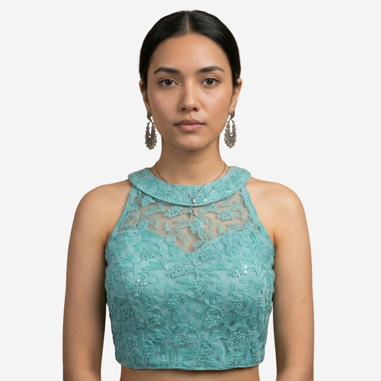 This designer partywear blouse is crafted from premium imported net, featuring heavy stitching, padding, and intricate work that adds charm to any festive or wedding look. Designed in a stylish back open pattern with detailed craftsmanship, it's a versatile piece that fits beautifully and offers alterable sizing from 36 to 40.