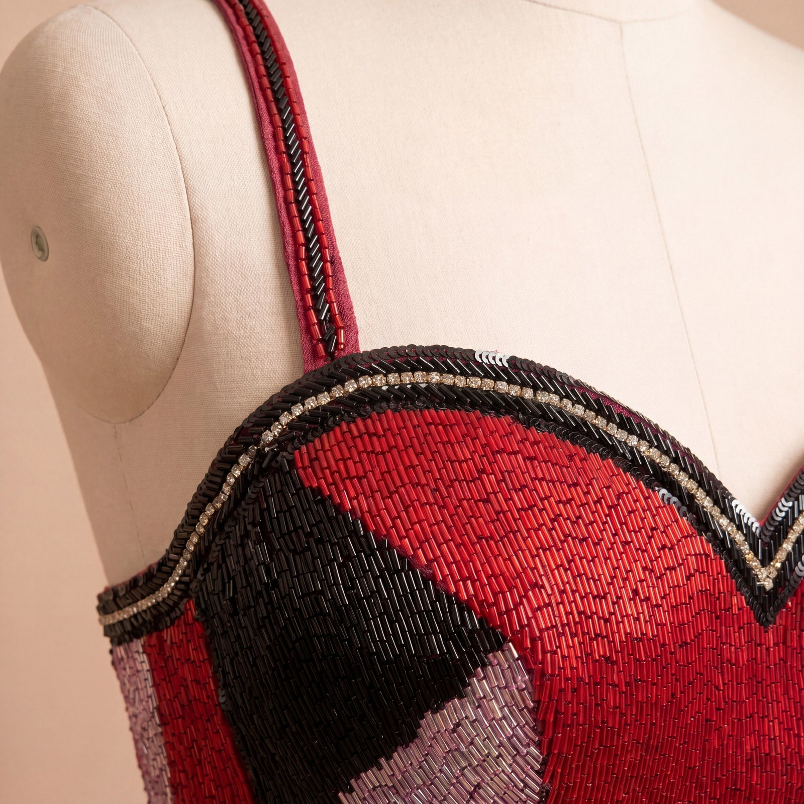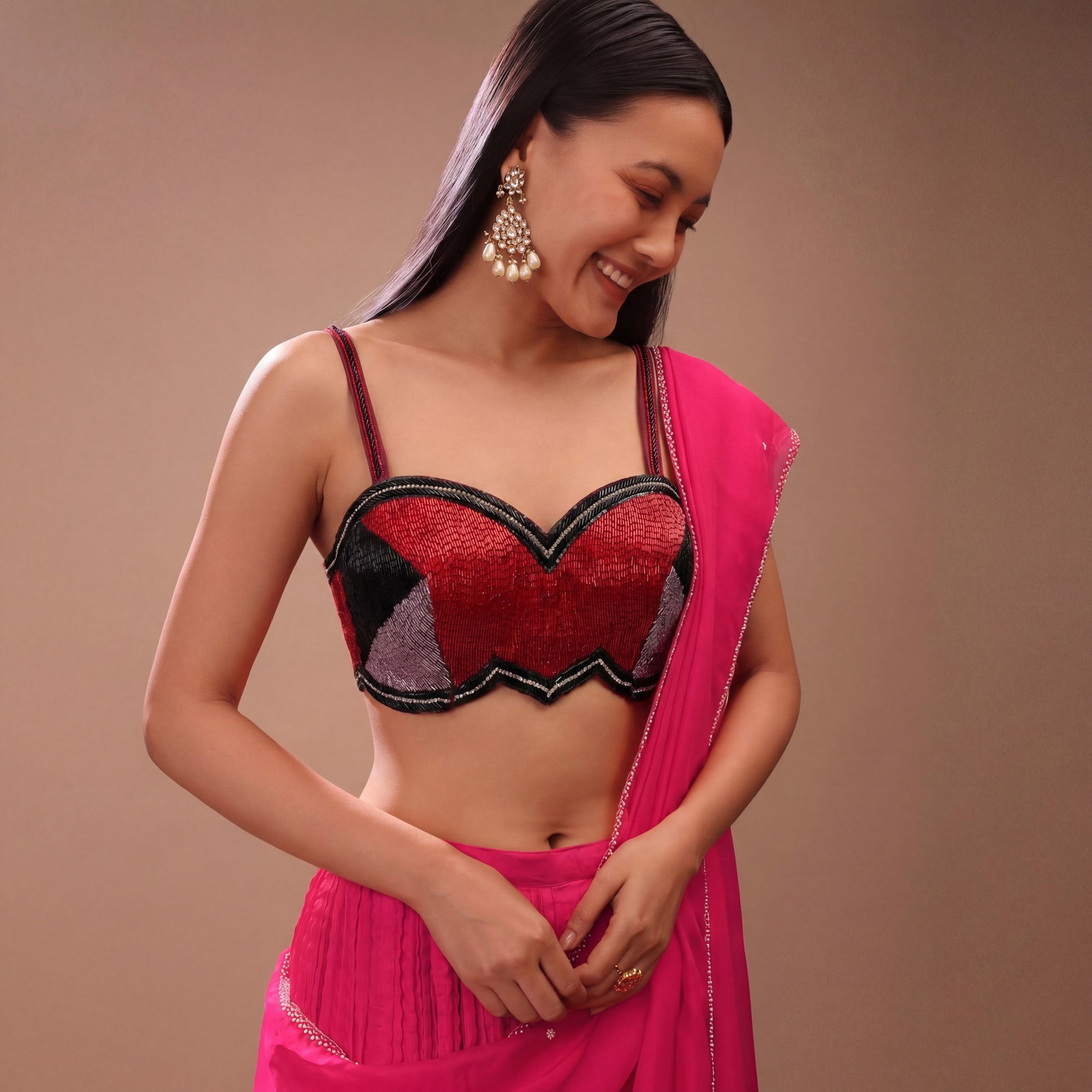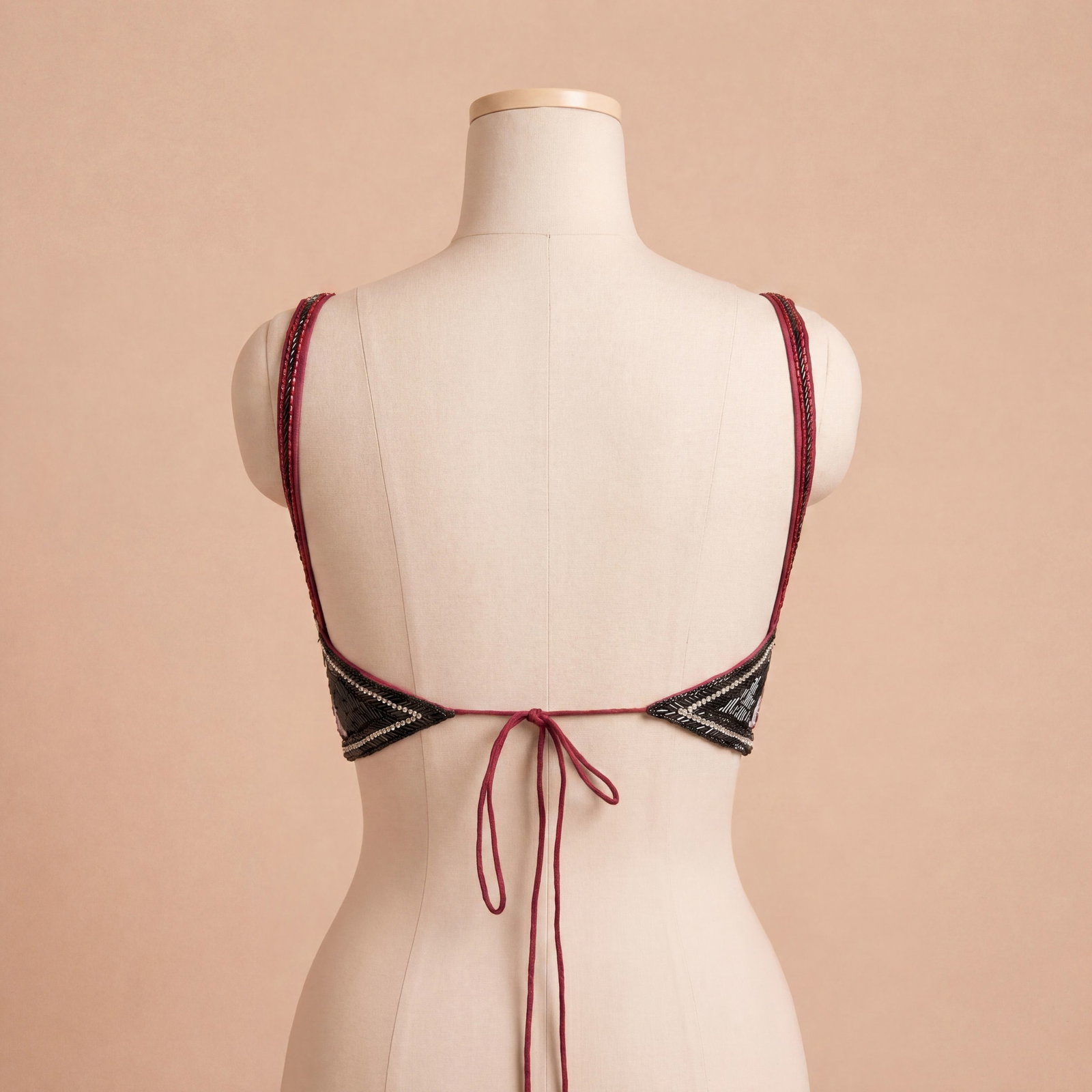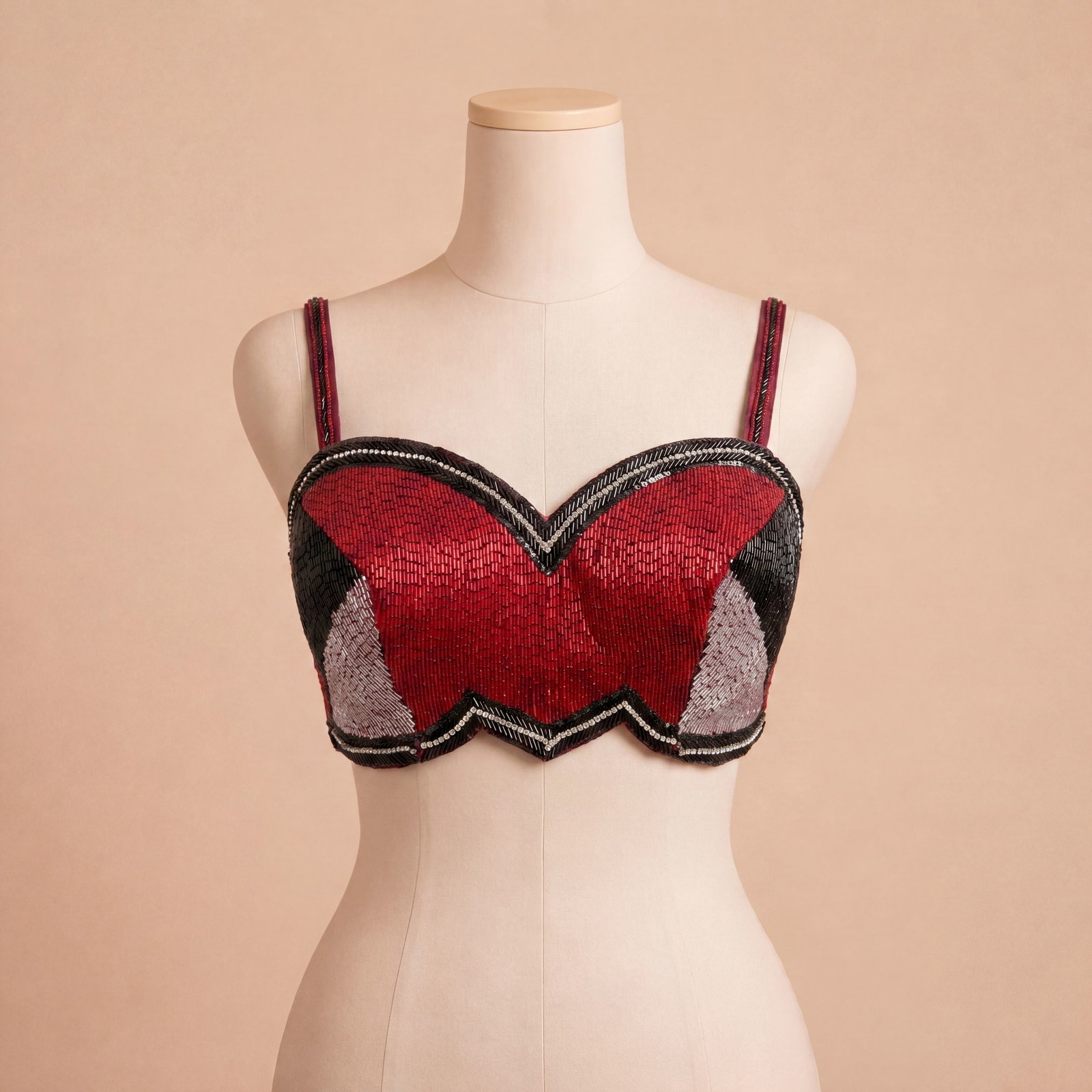 Elevate your festive look with this bold red and black designer blouse, crafted with intricate sequin embroidery and a modern geometric pattern. Featuring a stylish sweetheart neckline and sleek straps, this blouse offers a perfect blend of glam and elegance. Ideal for weddings, parties, and cocktail events, it delivers a flattering fit with premium finishing, making it a standout addition to your ethnic wardrobe.