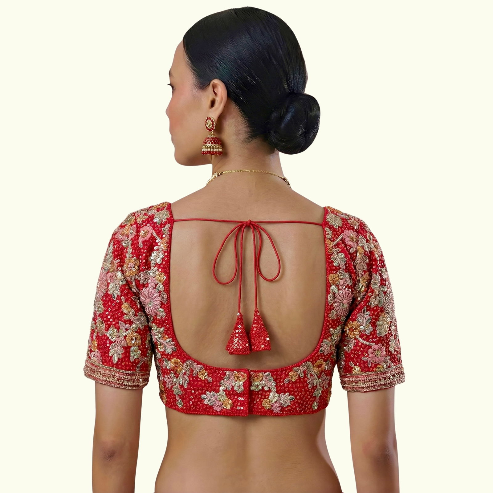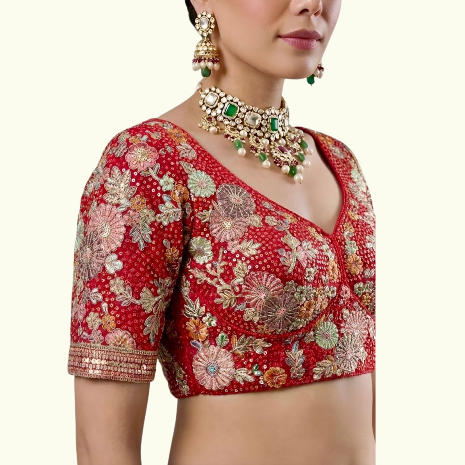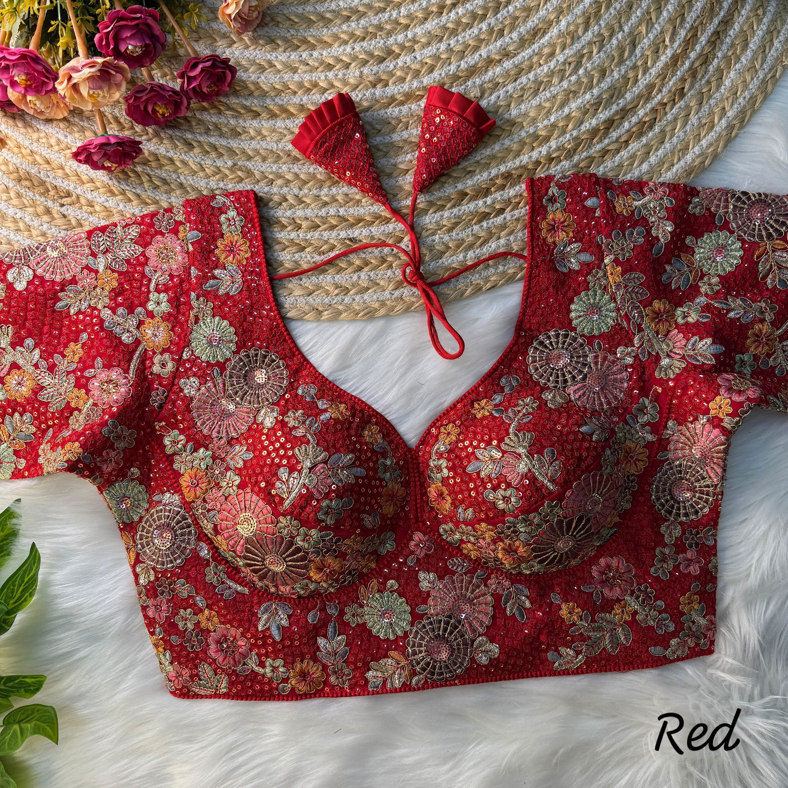 Step into elegance with this stunning wedding and partywear blouse made from heavy Fox Georgette. Featuring rich sequence and embroidery work, it comes with 9-inch long sleeves, heavy padding, and designer back-open styling. A perfect choice for festive and bridal occasions, offering comfort and flair in size 40, alterable up to 42.