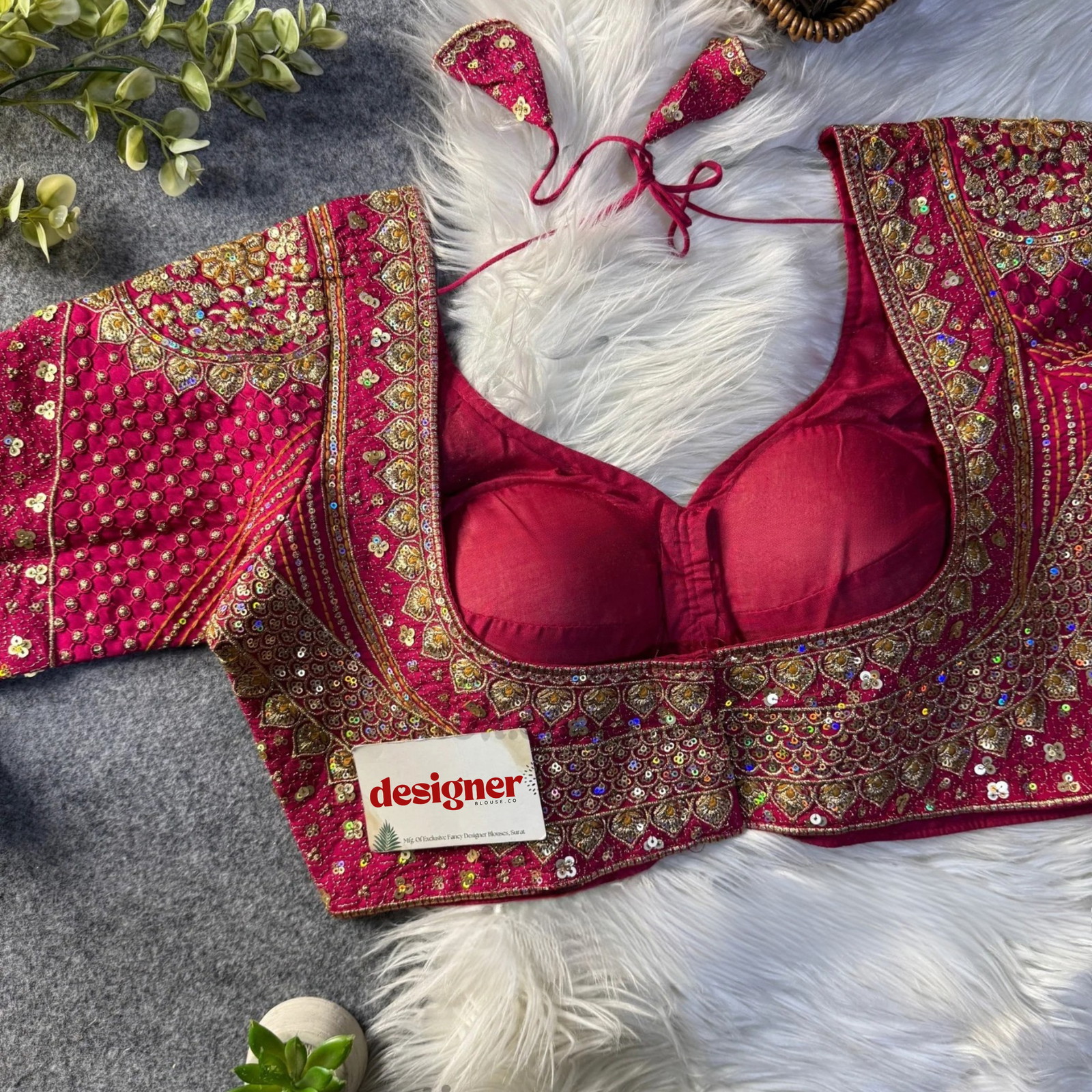 Elevate your bridal look with this Sabyasachi inspired blouse design in heavy georgette. Rich codding and shimmering sequins highlight the iconic Sabyasachi blouse design, paired with breathable cotton lining and built-in pads. this readymade blouse alterable 34–42 sizes—perfect for weddings, sangeet, and grand festive events.
