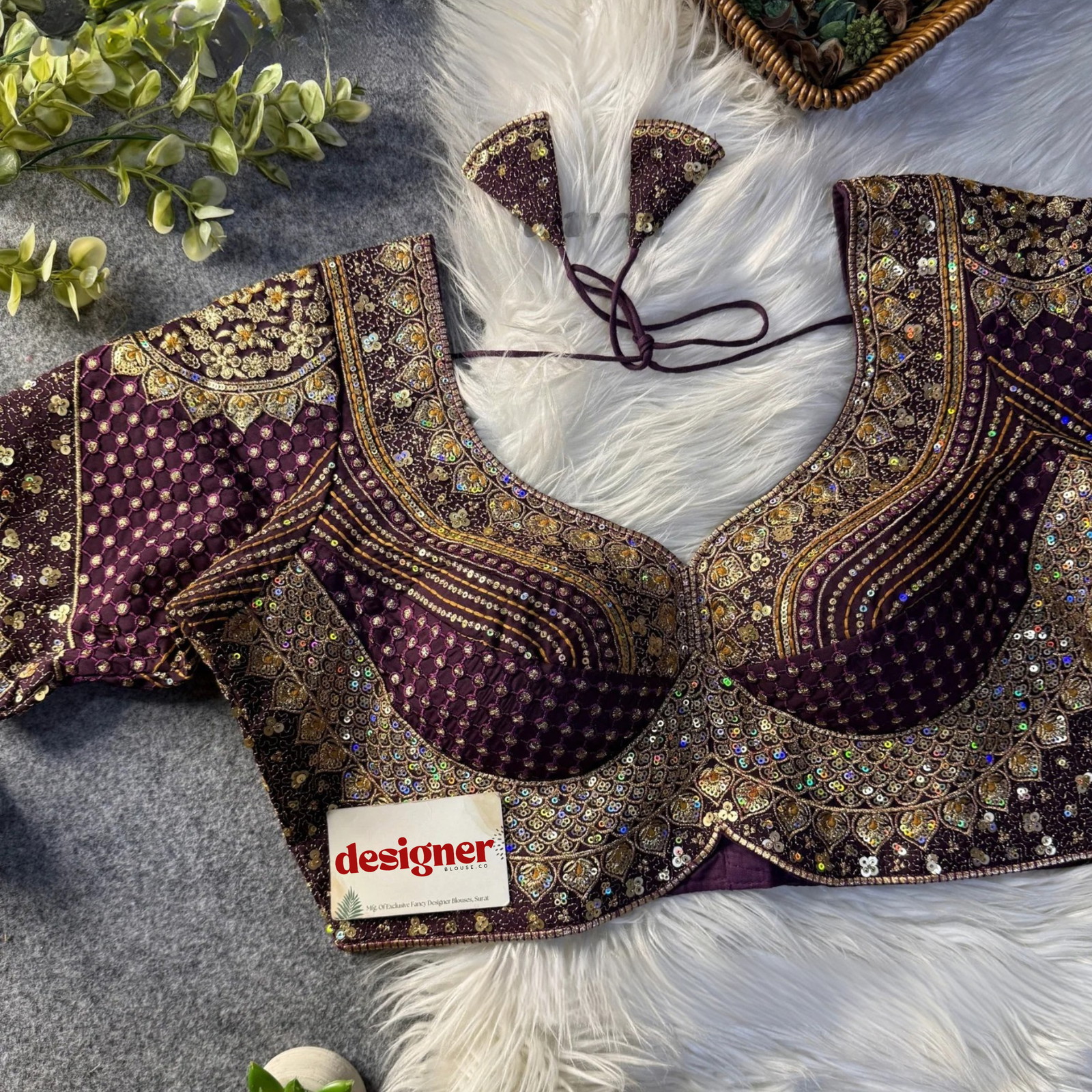 Elevate your bridal look with this Sabyasachi inspired blouse design in heavy georgette. Rich codding and shimmering sequins highlight the iconic Sabyasachi blouse design, paired with breathable cotton lining and built-in pads. this readymade blouse alterable 34–42 sizes—perfect for weddings, sangeet, and grand festive events.
