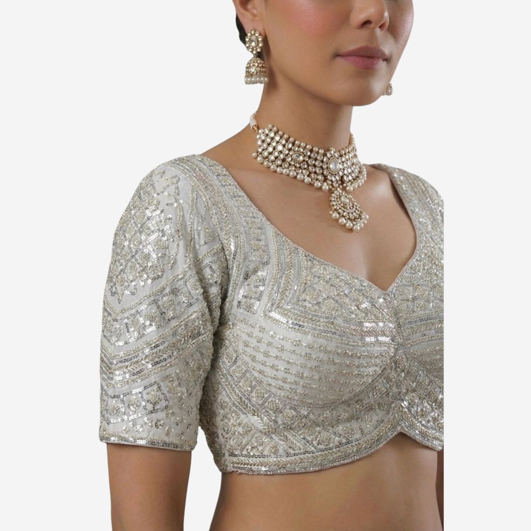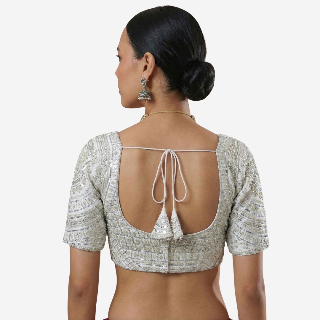 Glow in weddings and festive nights with this Rani Color Designer Partywear Blouse featuring a stunning Sabyasachi neck. Crafted in premium pure fox georgette, it’s richly finished with heavy hand embroidery and beadwork on front and sleeves. Soft cotton lining and built-in padding ensure comfort with a secure back-hook closure.