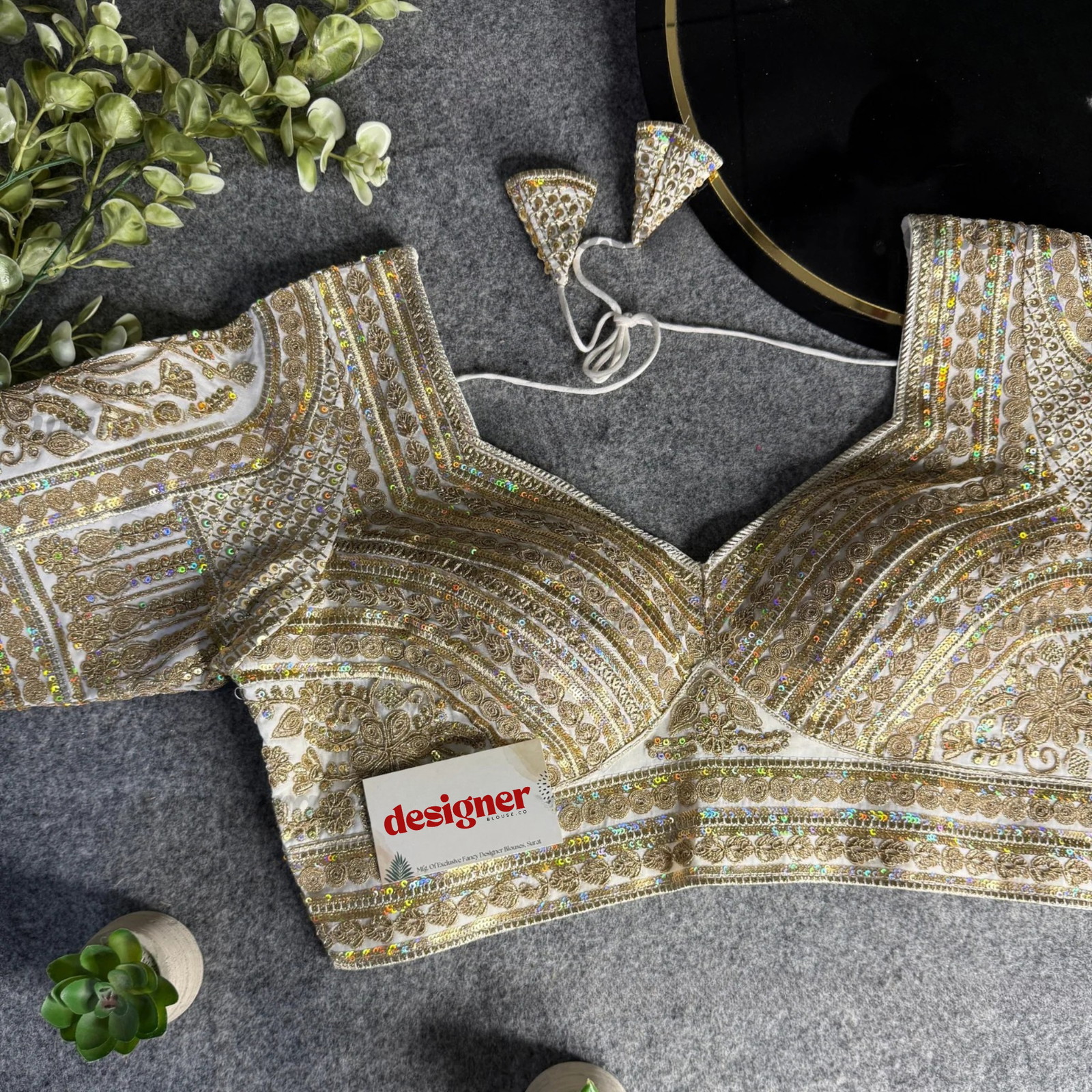 Elevate your wedding look with this bridal blouse in luxurious Italian Silk. This readymade blouse features all-over heavy embroidery and zari work, padded comfort, and a secure back-open design. Perfect with sarees or lehengas, the couture finish adds regal elegance for reception, sangeet, and festive celebrations with a flawless designer fit.