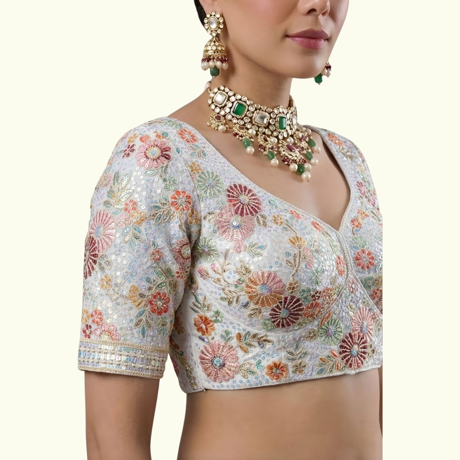 Step into elegance with this stunning wedding and partywear blouse made from heavy Fox Georgette. Featuring rich sequence and embroidery work, it comes with 9-inch long sleeves, heavy padding, and designer back-open styling. A perfect choice for festive and bridal occasions, offering comfort and flair in size 40, alterable up to 42.