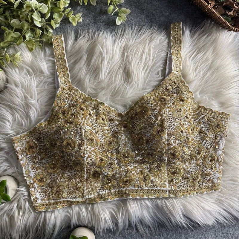 This luxury designer spaghetti blouse features intricate heavy embroidery with rich sequin and bead handwork, creating a stunning textured finish and premium festive appeal. Crafted from premium roman silk fabrics, this elegant white color blouse is designed for party, wedding, and special occasion wear. It offers a sleek, flattering fit with elegant shoulder straps for a modern silhouette. Perfect to pair with sarees, lehengas, or skirts for a glamorous and sophisticated ethnic look.