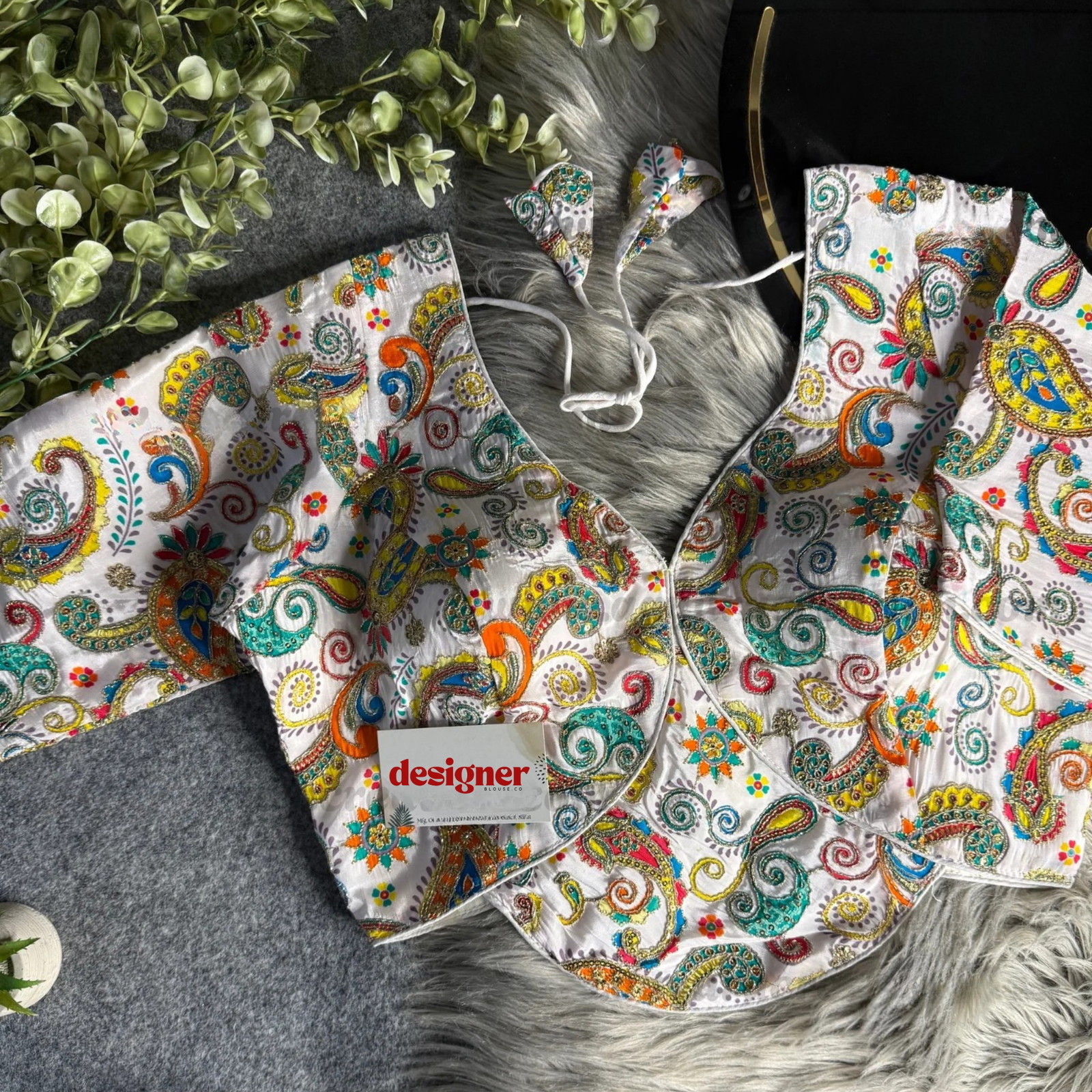 Elevate your ethnic look with this Pure Crepe Silk readymade blouse featuring designer position work. Back-open with hooks, 10+ inch sleeves and built-in padding deliver comfort and shape. A luxurious partywear and festive essential, tailored to flatter and easily alterable, blending modern grace with traditional charm for every special occasion.