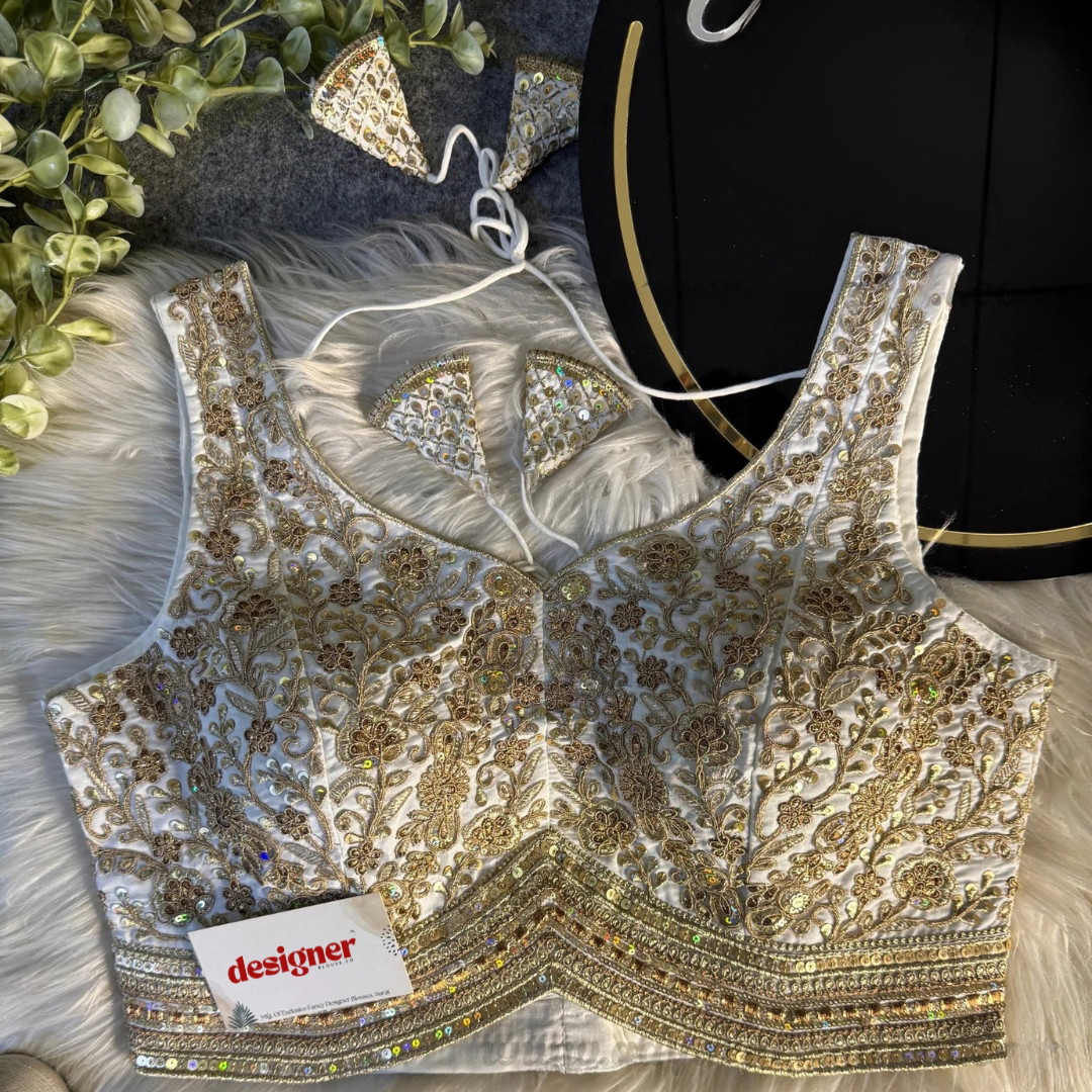 Elevate your saree look with this Italian silk designer blouse featuring heavy coding and shimmering sequin work. This readymade blouse comes padded with pure cotton lining, full sleeves and back-open hooks. it delivers a truly elegant premium finish for weddings, parties, and festive occasions.