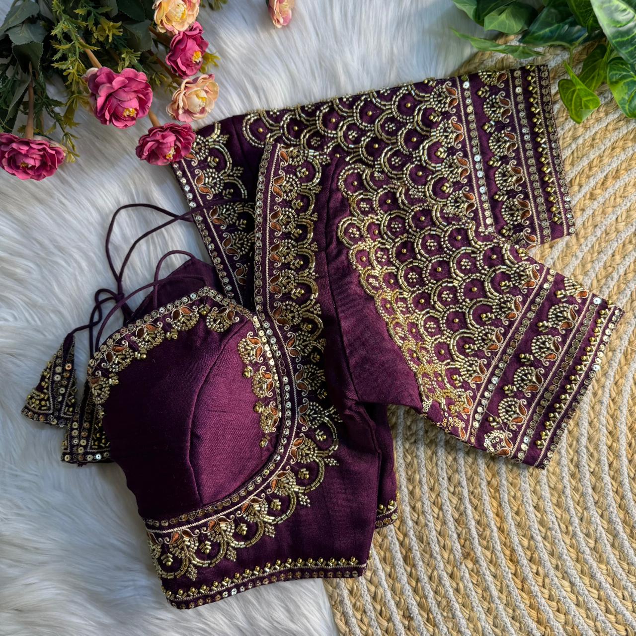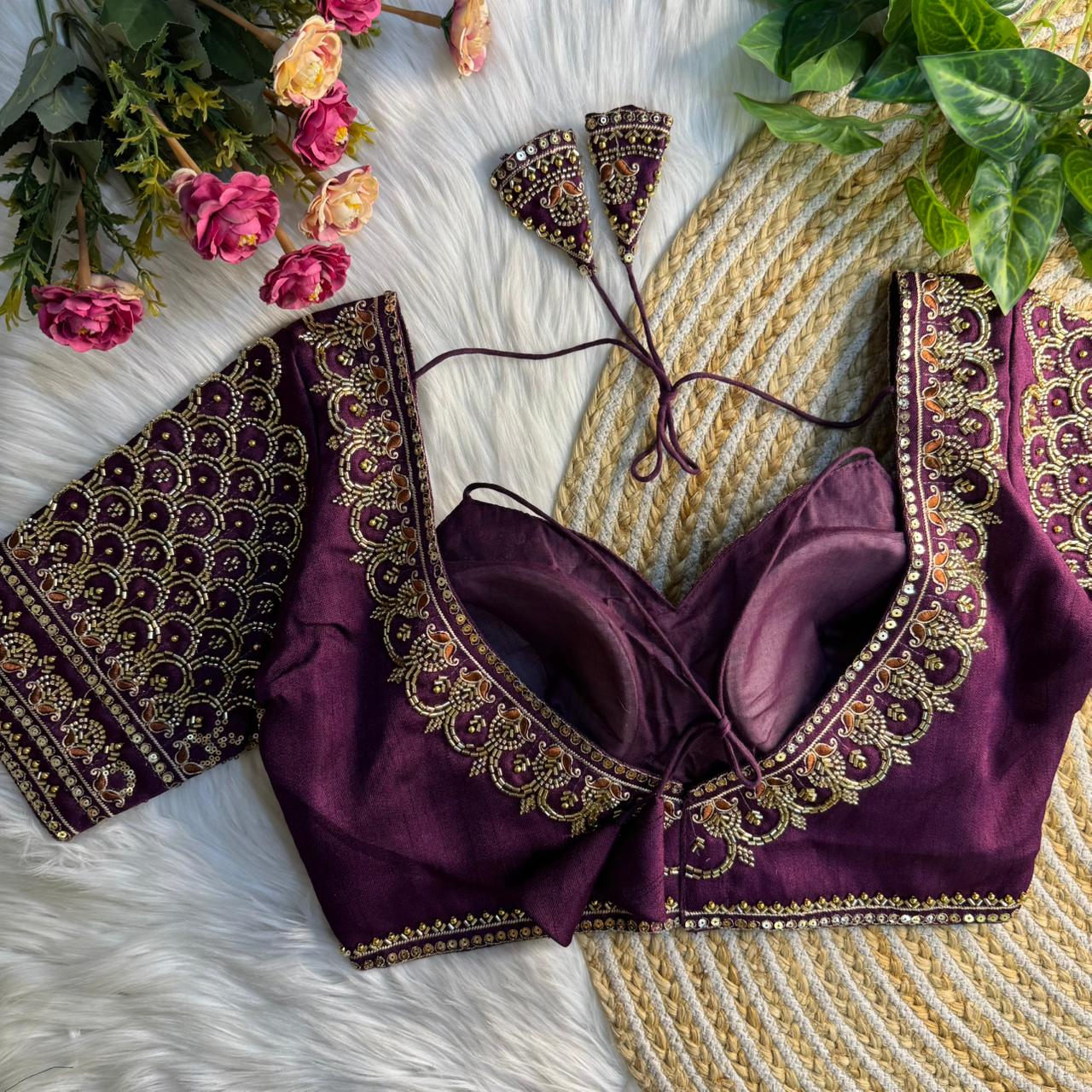 Elegant Italian Silk halter neck blouse with beautiful beads and rich embroidery work. Padded and back-open with hooks, this free-size designer blouse fits 34–42 bust and pairs perfectly with any saree or lehenga for weddings, receptions, and festive occasions.
